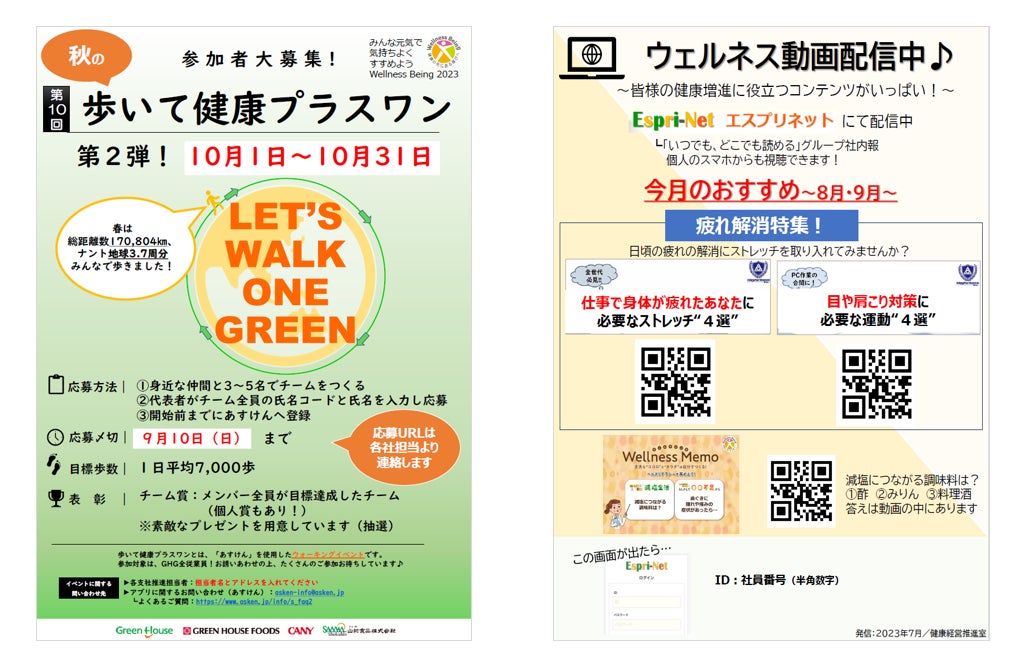 グリーンハウスグループは、2016年4月に健康経営の実践のため、「社員の健康増進で、いきいきと活躍できる職場と生産性向上で業績改善を実現する」とした健康企業宣言を制定、従業員が主体的に健康づくりに取り組める環境整備をさらに進めるとともに、食を通した健康の実現を図り、お客様の健康にも寄与していくことを目指しています。