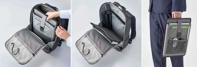 今回発売する「ノートPCを衝撃から守るビジネスリュック」は、外周に補強芯を入れた専用のバッグインバッグが付属しており、これによりノートPCを衝撃からしっかり保護するとともに、リュックから荷物を素早く取り出すことが可能です。
