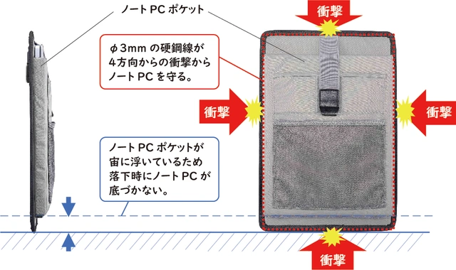 丈夫な硬鋼線(ピアノ線)で周囲を囲うことで、耐衝撃性能が向上した「専用バッグインバッグ」がノート