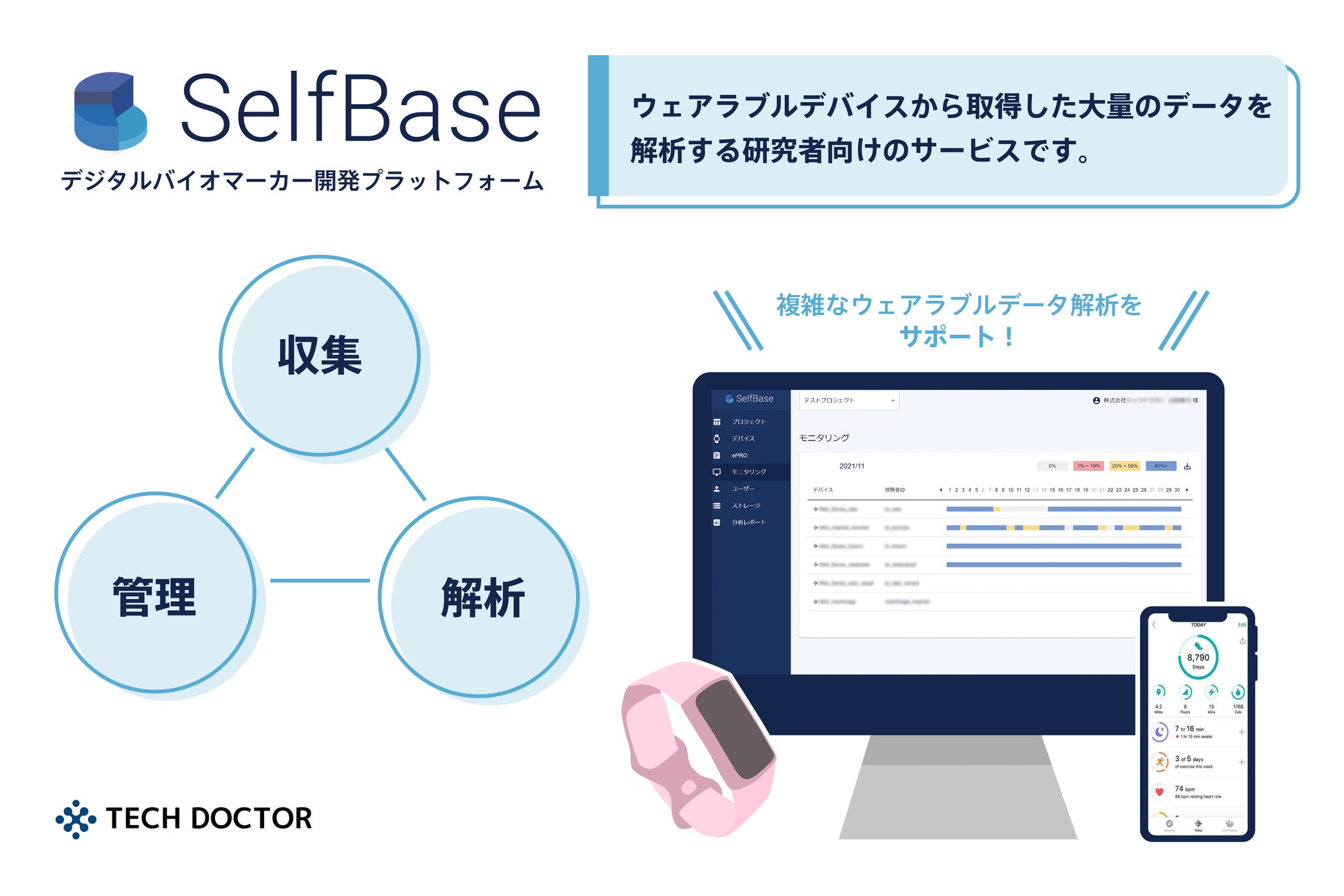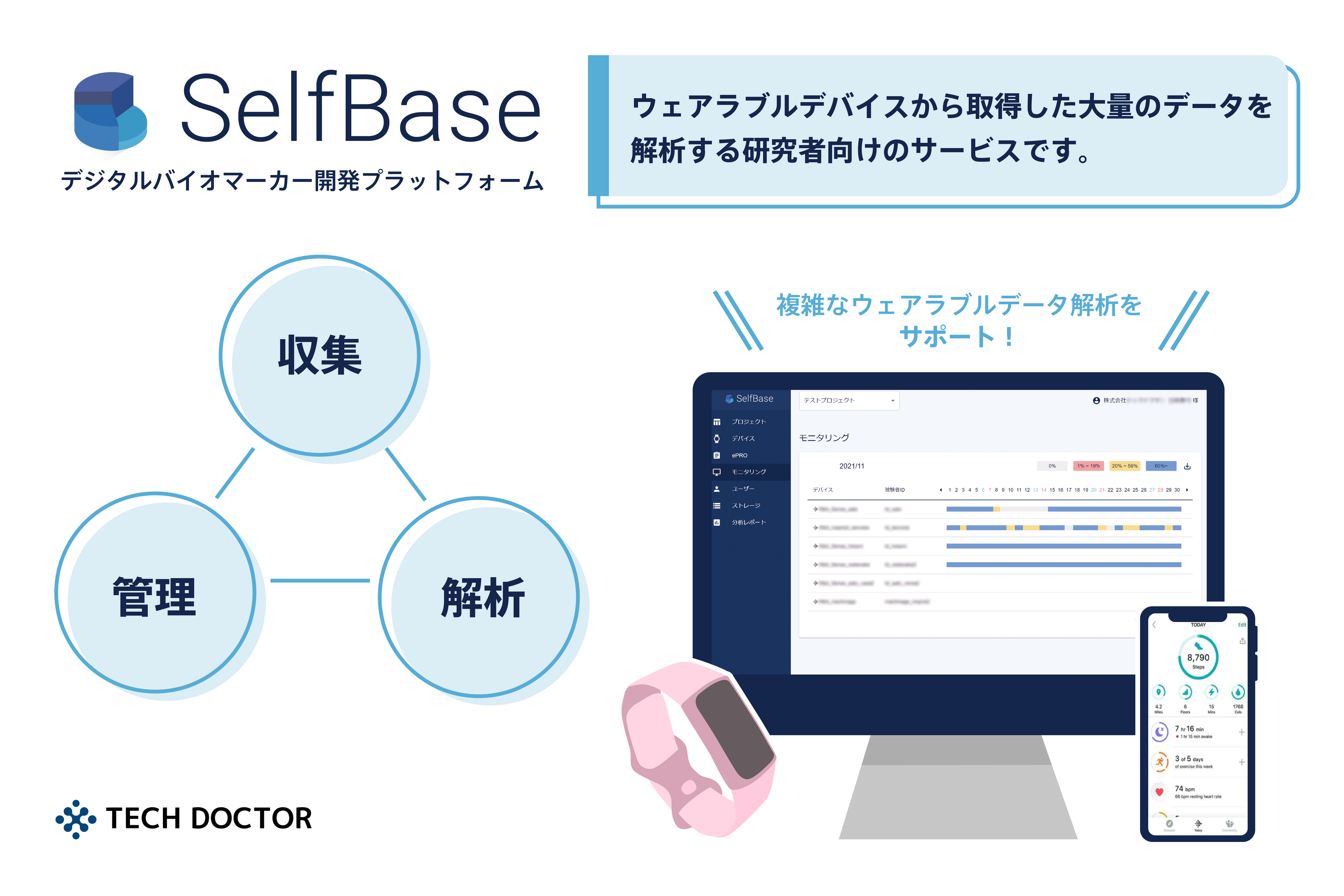 株式会社テックドクターは、"データで調子をよくする時代へ"をビジョンに掲げ、ウェアラブルデバイス等で取得できるデータの企業・医療機関向けソリューション「SelfDoc.」と、医療・製薬・食品関連企業や研究機関向けのデジタルバイオマーカー開発プラットフォーム「SelfBase」を展開しております。