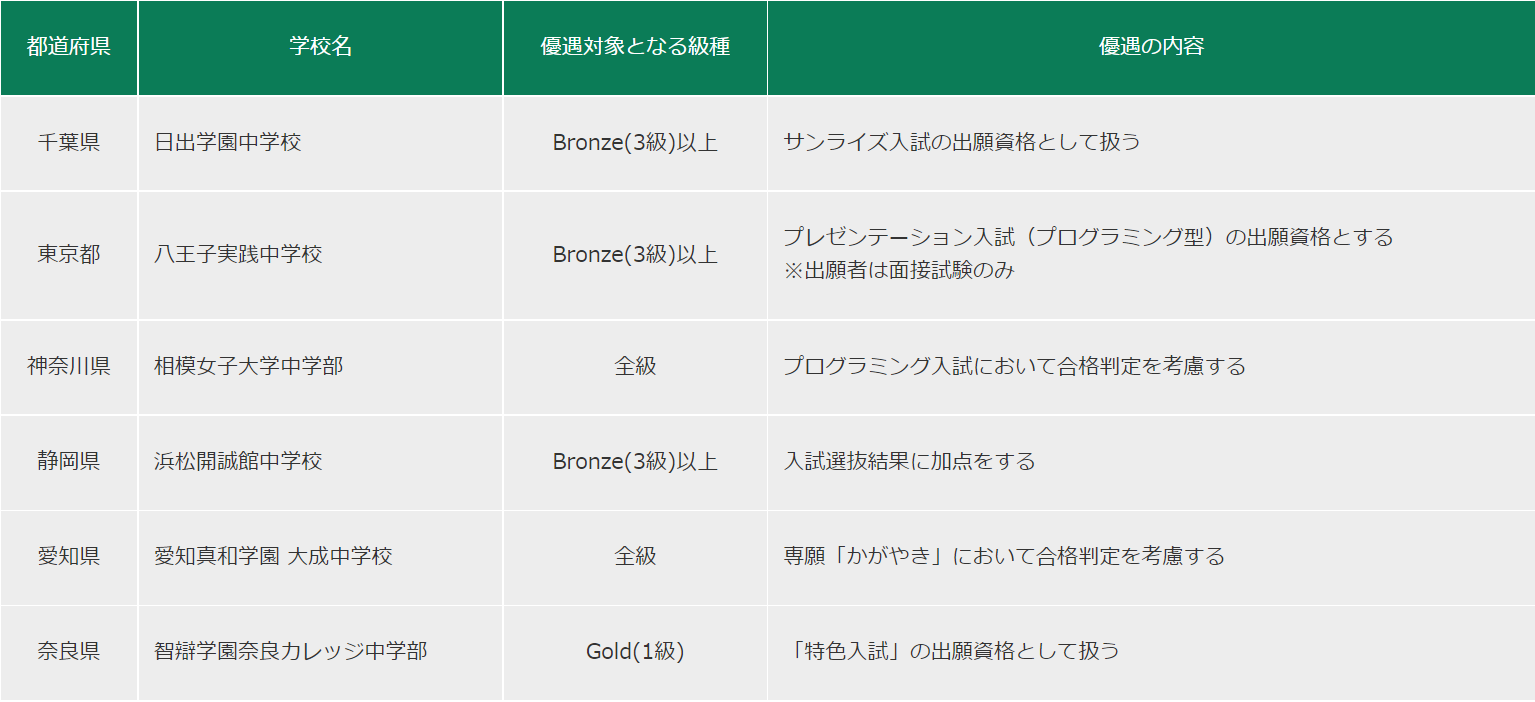 ジュニア・プログラミング検定の合格者は、当該優遇校の入学試験において合格判定が考慮されたり一部の試験が免除となるなどの優遇措置を受けることができます。