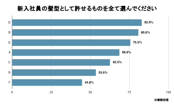 新入社員の髪型として許せるものをA〜Gで選んでもらったところ、8割以上の回答があったものはDの「センターパート」(82.9%)と、B(80.6%)の前髪が長めで分けているスタイルでした。どちらも額の一部が見えており、ナチュラルな印象があります。