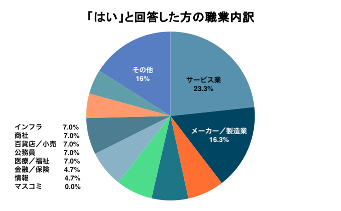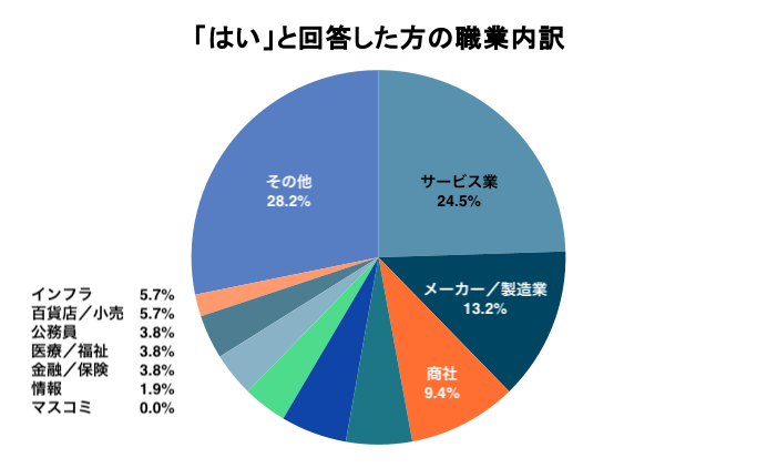 「注意をしたことがある」の質問と同様に、サービス業やメーカー/製造業は、他の業種と比較すると注意を受けたことがある人も多いようです。