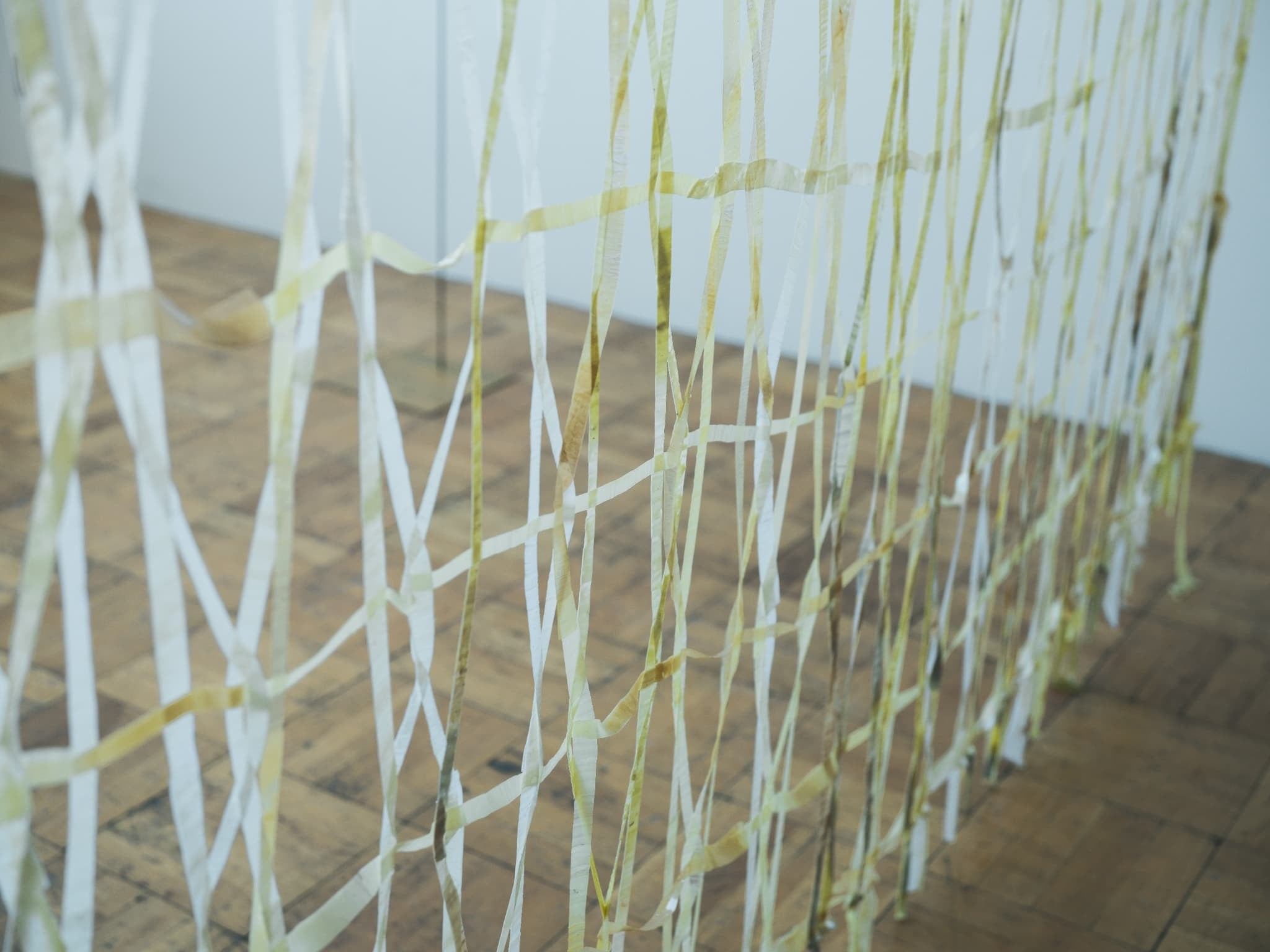 編み、組み直された絵は、壁面に固定されることなく、空間の中で成立する位置を与えられている。絵具は張力と密度の差を生み、像は自立も接地もしない。