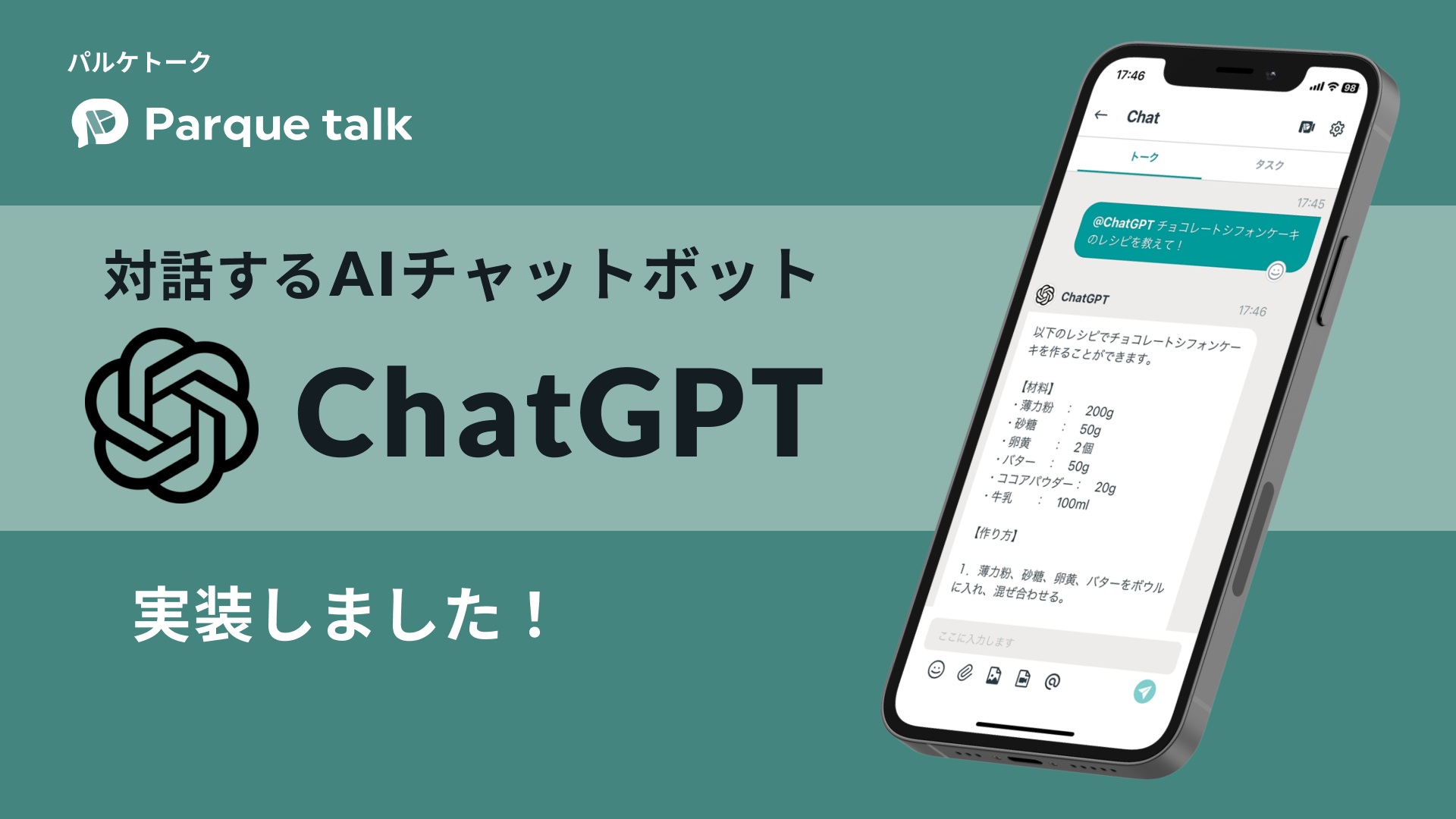パルケトークではチャットアプリの中でもChatGPTにいち早く着目し、トーク内でChatGPTをメンション[@ChatGPT]して質問を送信すると、ChatGPTから回答を受信するという「チャットボット機能(β版)」を追加しました。