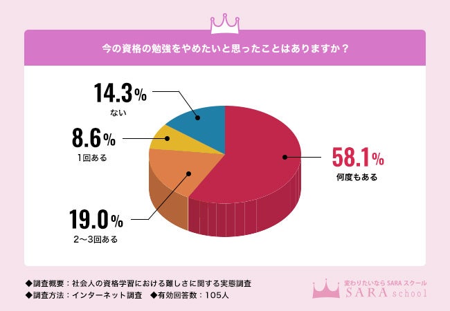 そこで今回、通信教育講座『SARAスクールジャパン』(https://www.saraschool.net/)を運営する株式会社新生技術開発研究所は、スマホ・パソコン・タブレットからいつでも資格取得の勉強ができるオンライン講座「スマシカ」を開講したことに伴い、何かしらの資格学習をしている全国20〜60代の社会人男女105名を対象に、社会人の資格学習における難しさに関する実態調査を実施しました。