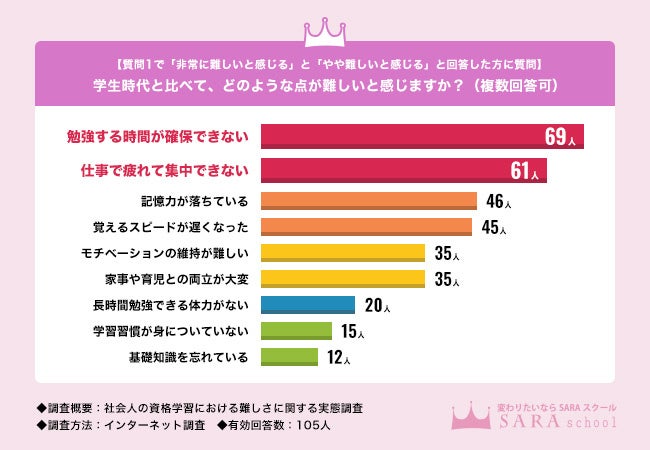 そこで、次に前の設問で「非常に難しいと感じる」と「やや難しいと感じる」と回答した97.1%の社会人を対象に、「学生時代と比べて、どのような点が難しいと感じますか?(複数回答可)」と聞いてみました。その結果『勉強する時間が確保できない』(69人)が最多となりました。