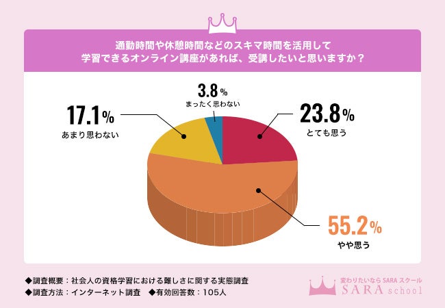 最後に「通勤時間や休憩時間などのスキマ時間を活用して学習できるオンライン講座があれば、受講したいと思いますか?」と質問したところ、『やや思う』(55.2%)と回答した方が最多となりました。『とても思う』(23.8%)と合わせると、79.0%の社会人が、スキマ時間を活用して学習できるオンライン講座に前向きな姿勢を示しています。