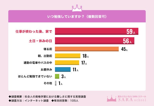 社会人が勉強している時間帯を把握すべく「いつ勉強していますか?(複数回答可)」と質問したところ、『仕事が終わった後、家で』(59人)が最多回答数となりました。次に『土日・休みの日』(56人)、『寝る前』(45人)が続いています。