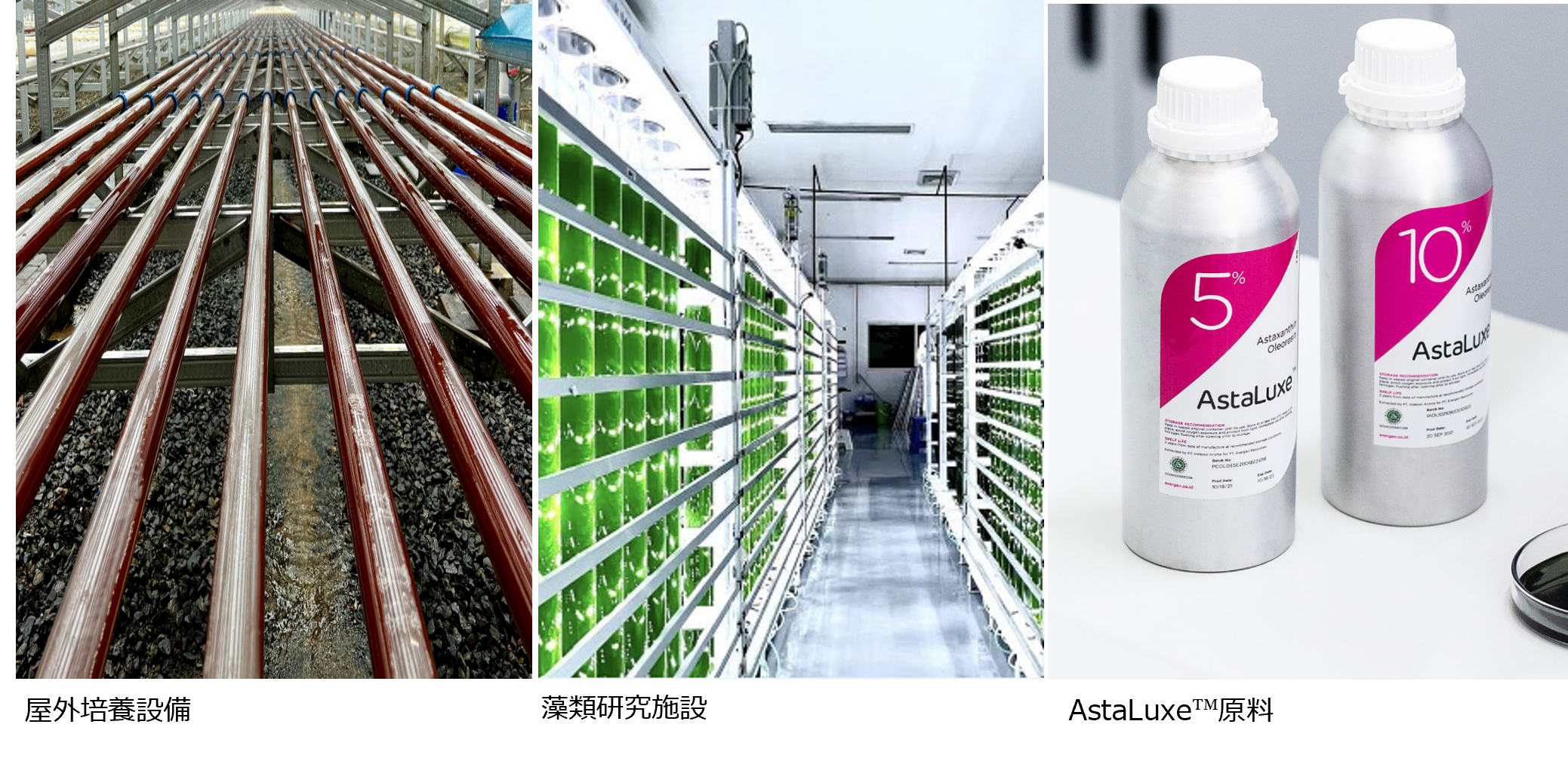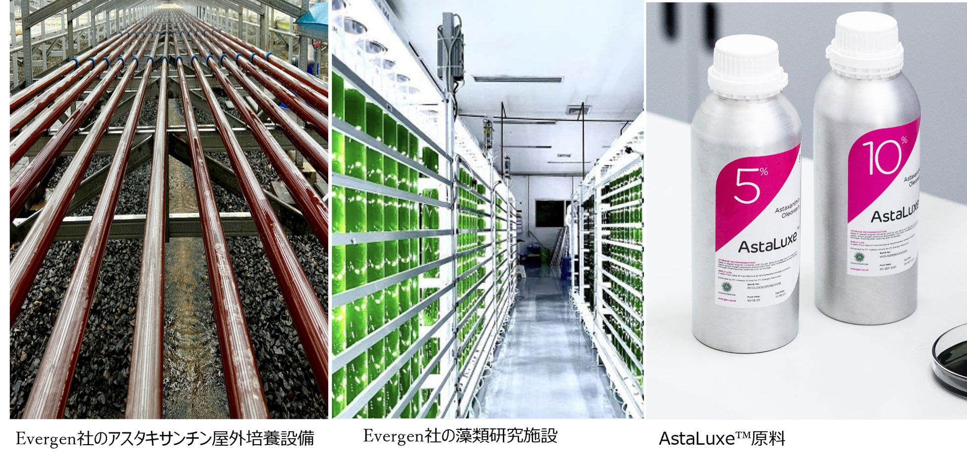 Evergen社は、既に「アスタキサンチン」の含有する微細藻類を大規模な屋外培養設備により培養、抽出、製品化し、世界数か国で「AstaLuxe™」としてアスタキサンチン原料として化粧品や健康食品の業界で実績のある企業となります。