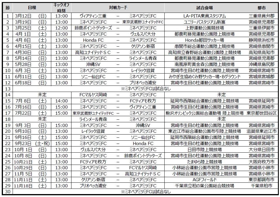 詳細は、ミネベアミツミFCウェブサイト掲載の試合日程一覧、およびJFLオフィシャルWebサイトをご覧ください。