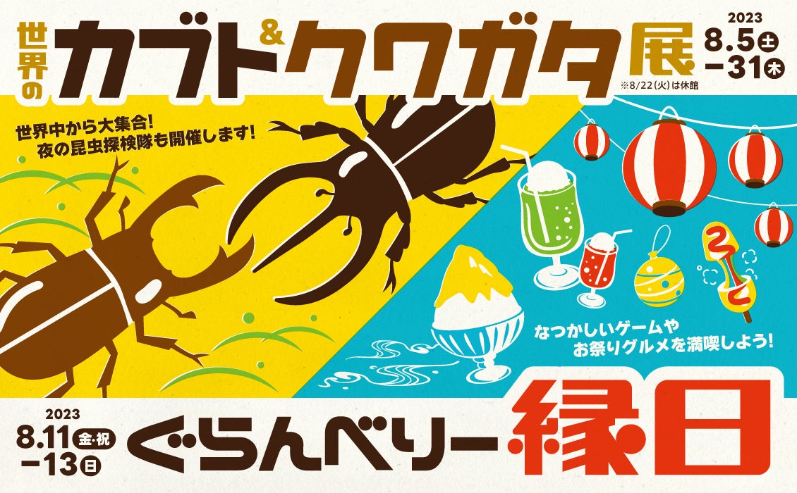 サマーイベントの目玉は、今年で2回目の開催となる「世界のカブト&クワガタ展」。新たに「夜の昆虫探検隊」が加わり、隣接する鶴間公園で昆虫ガイドによる解説とともに夜の昆虫探検を実施します。また、昨年多くの来場者でにぎわった「ぐらんべりー縁日」では、昔ながらの懐かしいゲームやお祭りグルメなど、子どもだけでなく大人も楽しめるコンテンツが盛りだくさんです。