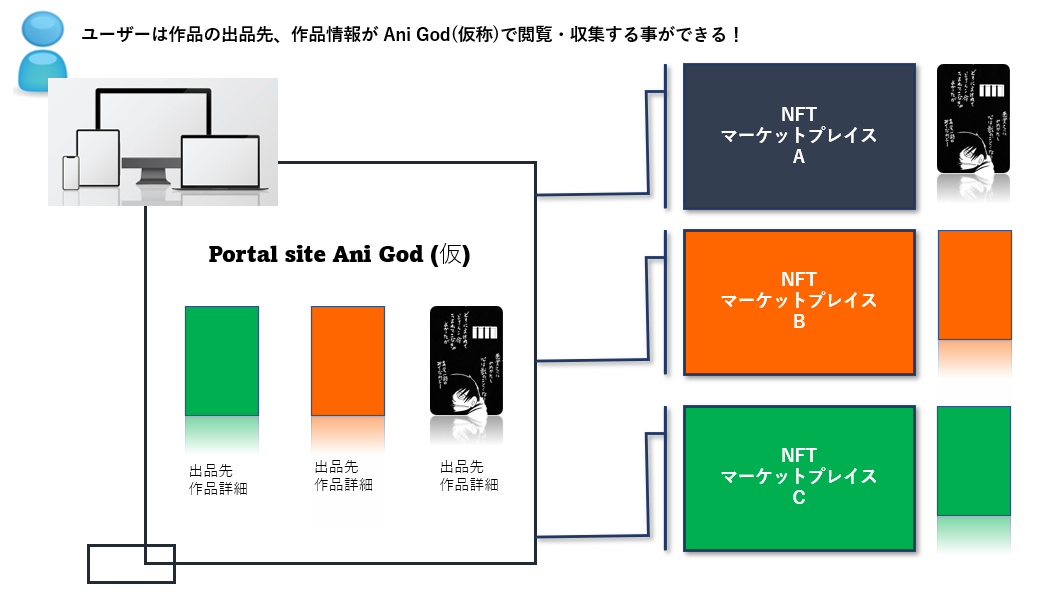 作品の出品先、希少価値情報、在庫などユーザーがNFTマーケットプレイスを閲覧する前に作品情報を収集(チェック) する情報収集サイト ( 仮称:Ani God Portal ) の展開を⾏います。