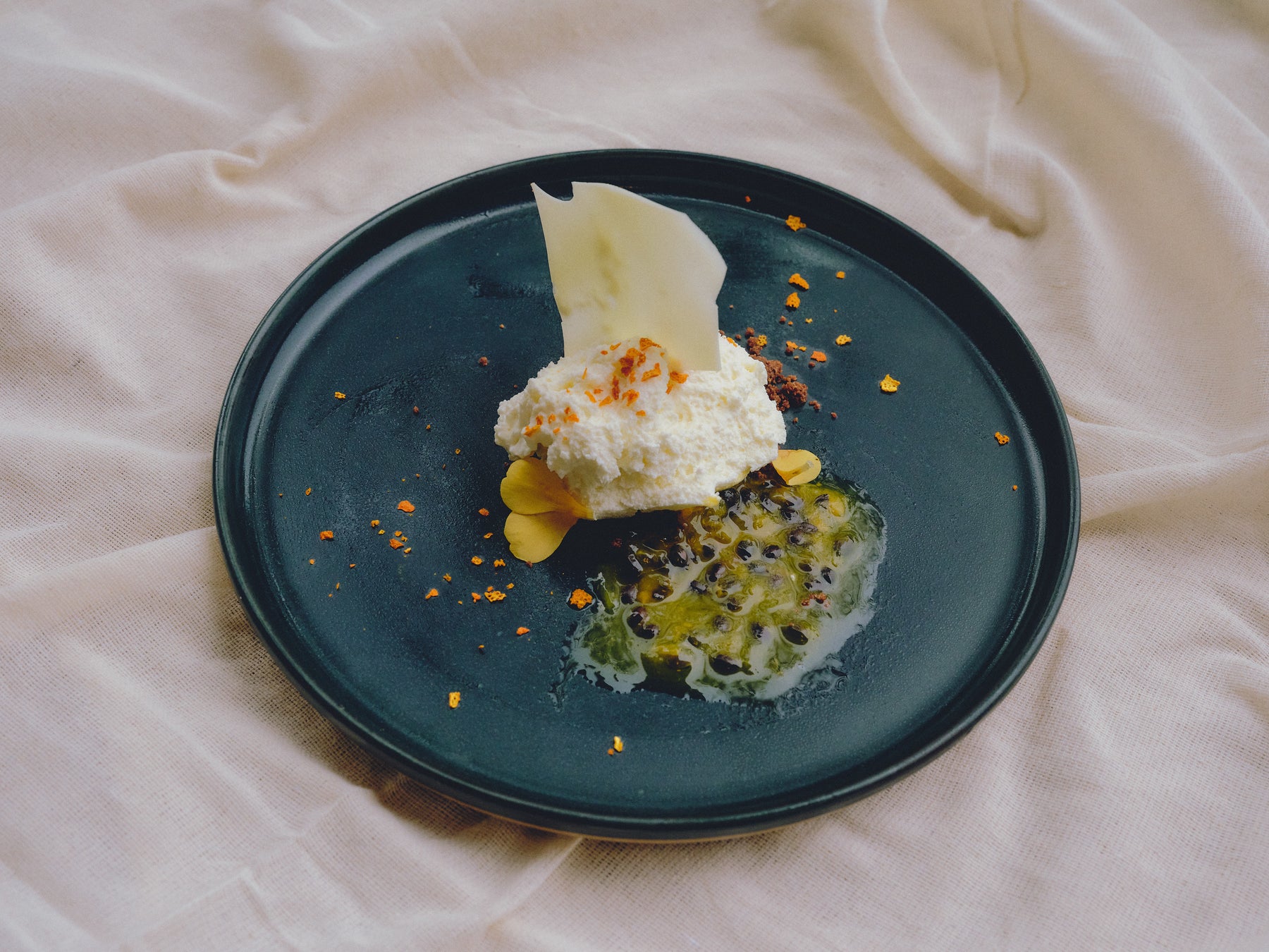 フロマージュブラン、生クリーム、メレンゲを合わせた、ふわふわと軽いチーズケーキのようなフランス・アンジュ地方のデザート。サクサクのクランブルと季節のフルーツの甘酸っぱいパッションフルーツを合わせました。