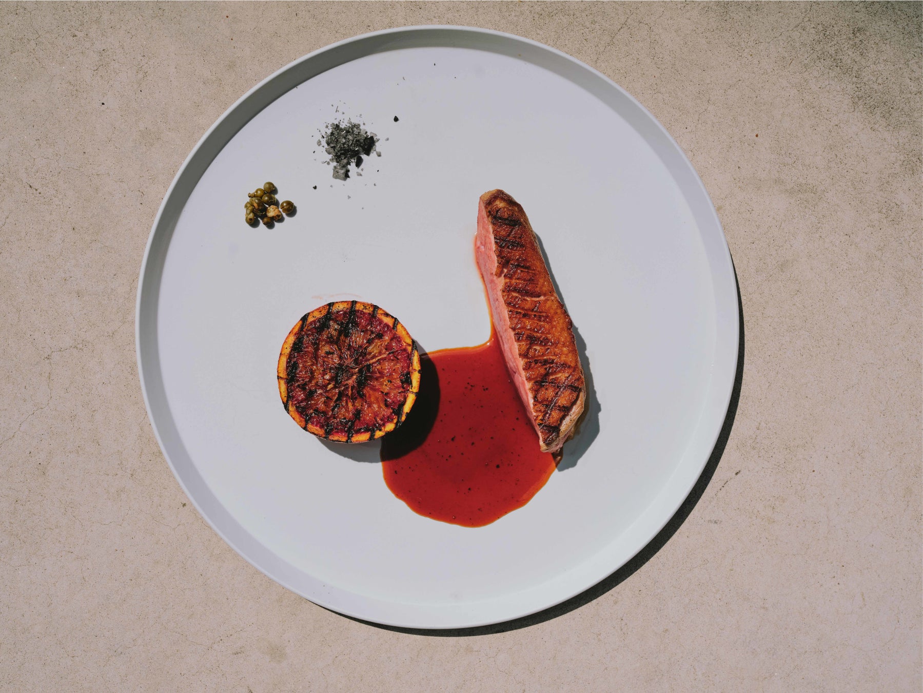 豪快に炭火で表面を焼き上げながら、中は柔らかくしっとりとした食感になるように焼き加減にこだわりました。オレンジとレモン果汁を煮詰めてフォン・ド・ヴォーを合わせたソースと炭火で焼き上げたオレンジを添えています。