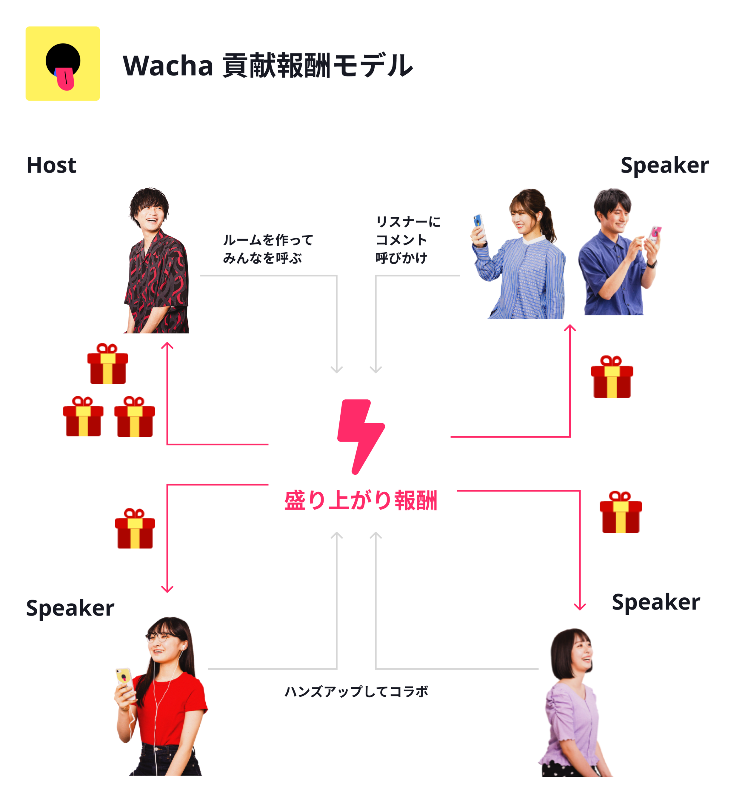 Wachaでは、これらの不満や課題を解消すべく、今回独自に取り入れた「ギフト機能」と「貢献報酬※1」のシステムにより、ライバーとリスナー双方が、それぞれの役割を各自のペースに合わせて行うことで、それぞれにギフトを分配することができるようになりました。今後は、配信中に課金式でギフトを送ることが可能になり、またそれがホストだけでなく、ルームにハンズアップしたスピーカーにも分配されます。