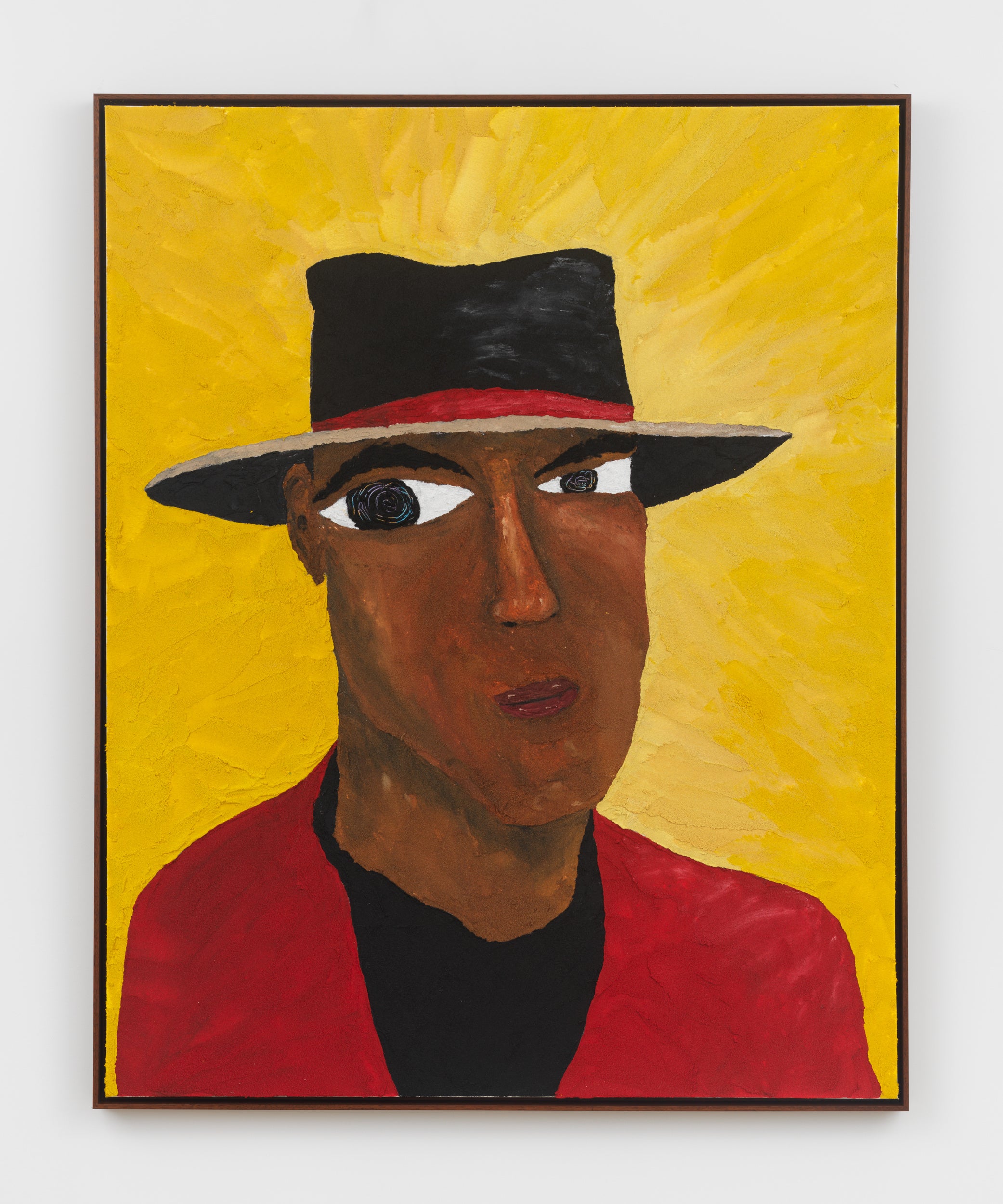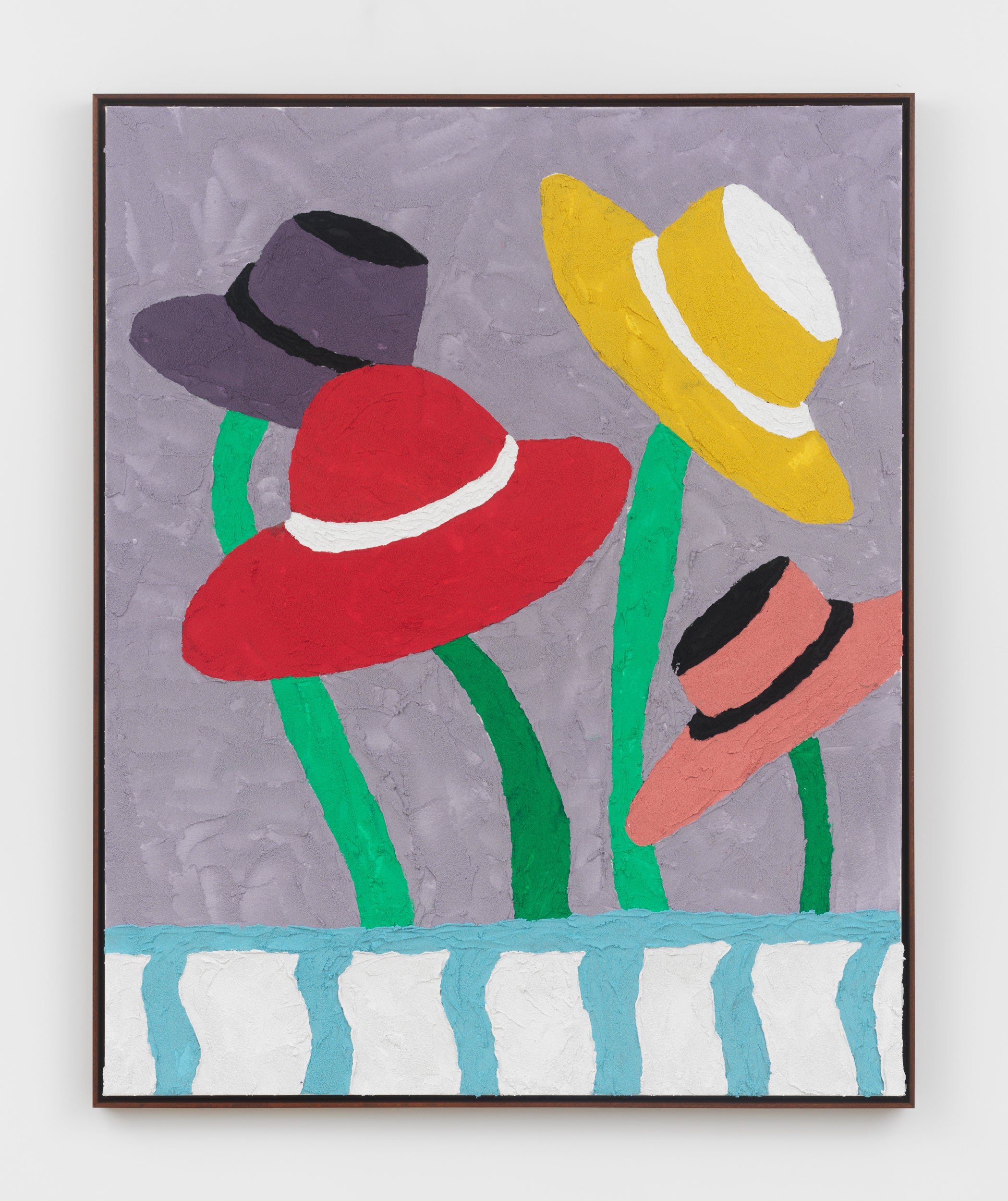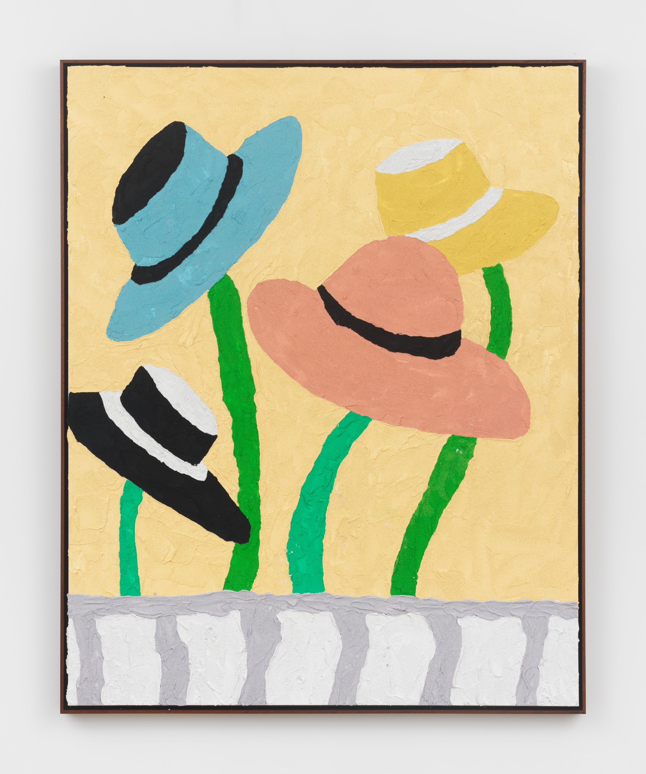 この『Blooms』と並んで、Mr.StarCityが現在取り組んでいるポートレート シリーズの続編となる2作品も展示。『Yellow of the Sun』は、燃えるようなソーラーゴールドを背景色に使う一方、『When it Rains it’s Blue』は、エレクトリックシアンから謎めいた深みのあるインディゴへと色調が変化していきます。『Blooms』の植物と同様、こうしたポートレートに描かれた人物も、太陽と雨の両方から私たちを守る冠である「帽子」をかぶっています。