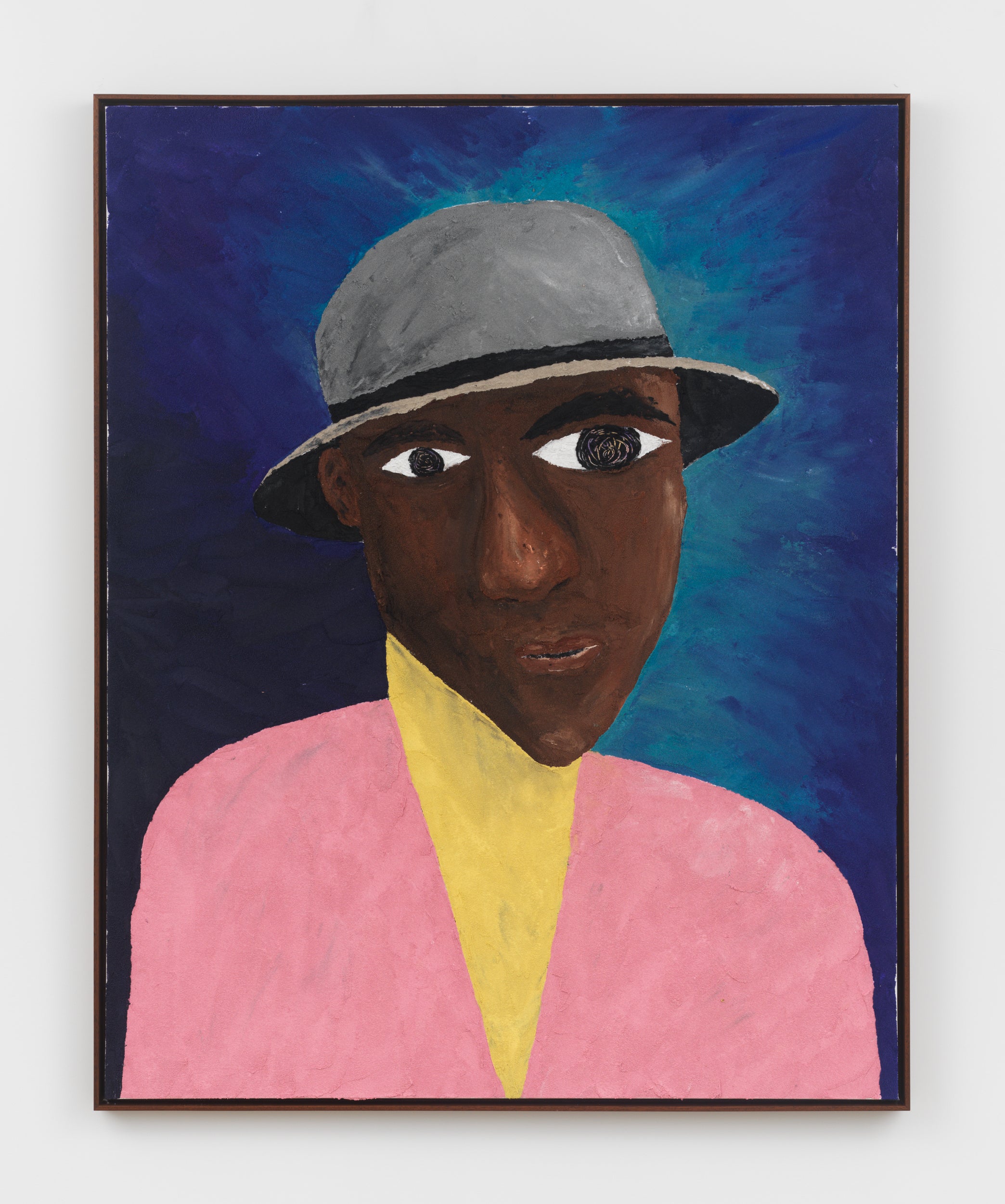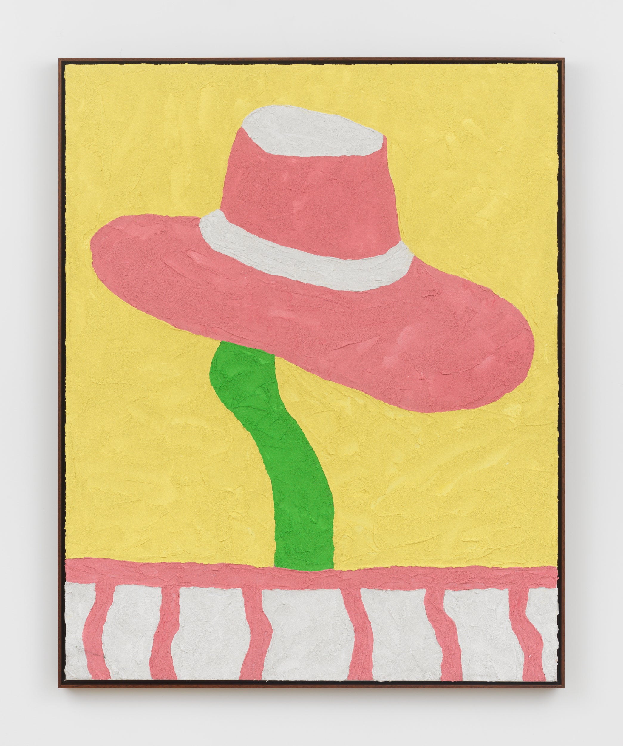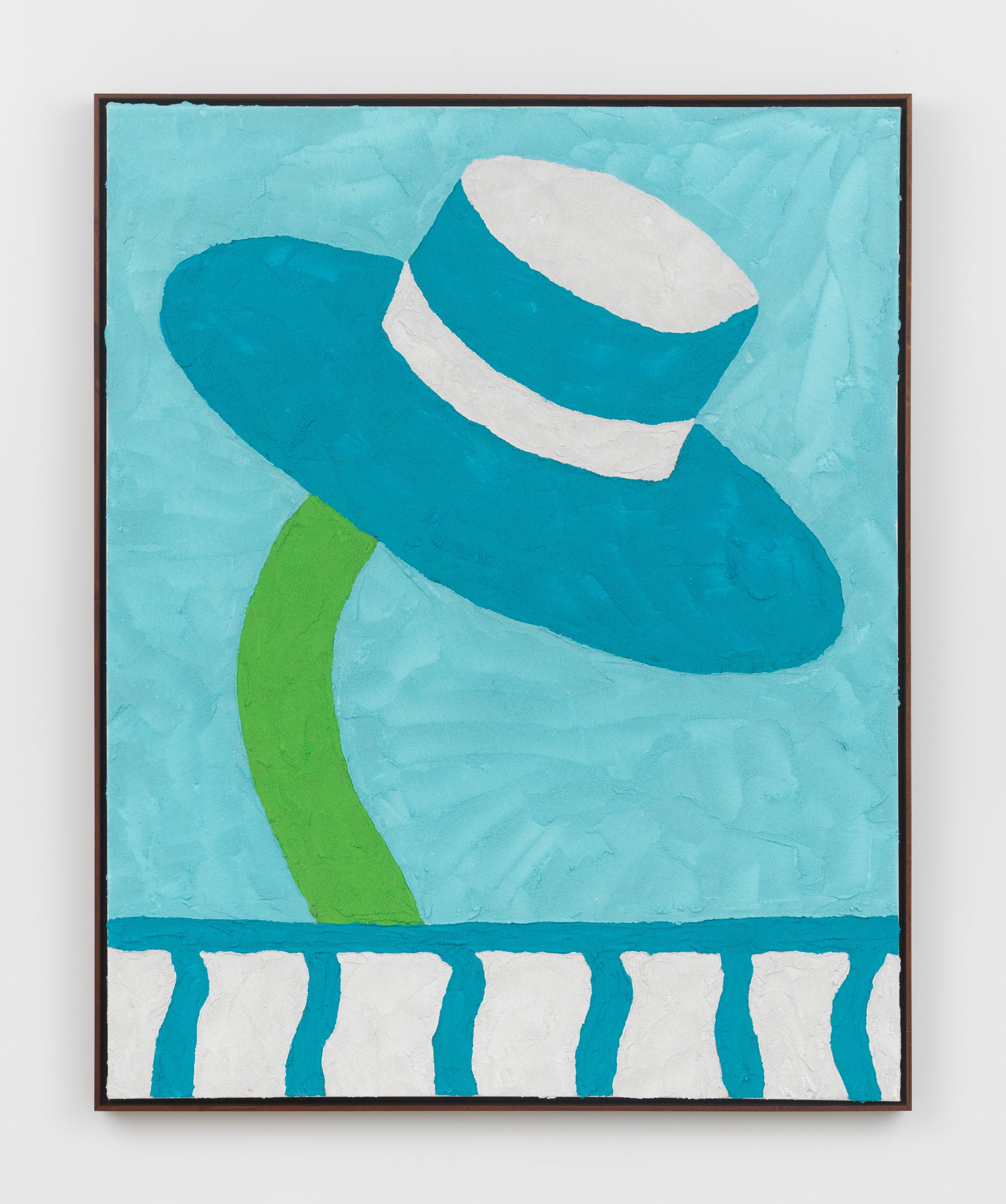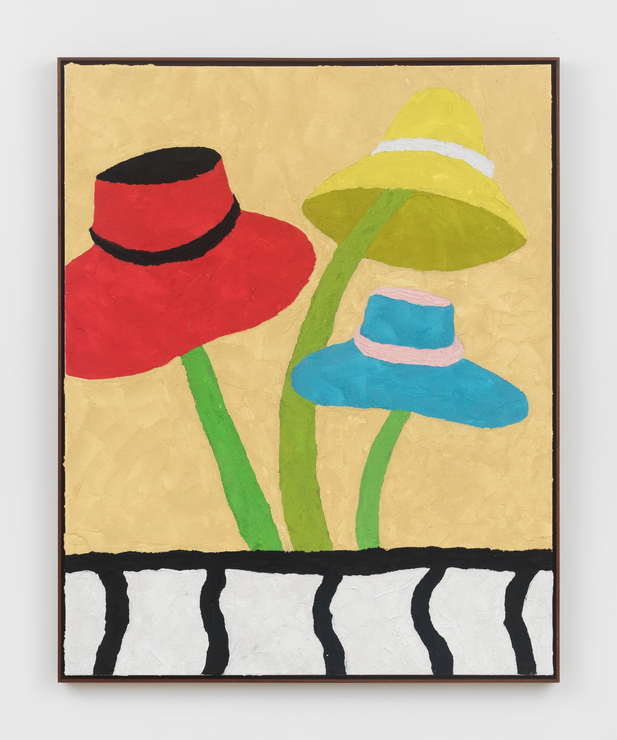 この『Blooms』と並んで、Mr.StarCityが現在取り組んでいるポートレート シリーズの続編となる2作品も展示。『Yellow of the Sun』は、燃えるようなソーラーゴールドを背景色に使う一方、『When it Rains it’s Blue』は、エレクトリックシアンから謎めいた深みのあるインディゴへと色調が変化していきます。『Blooms』の植物と同様、こうしたポートレートに描かれた人物も、太陽と雨の両方から私たちを守る冠である「帽子」をかぶっています。