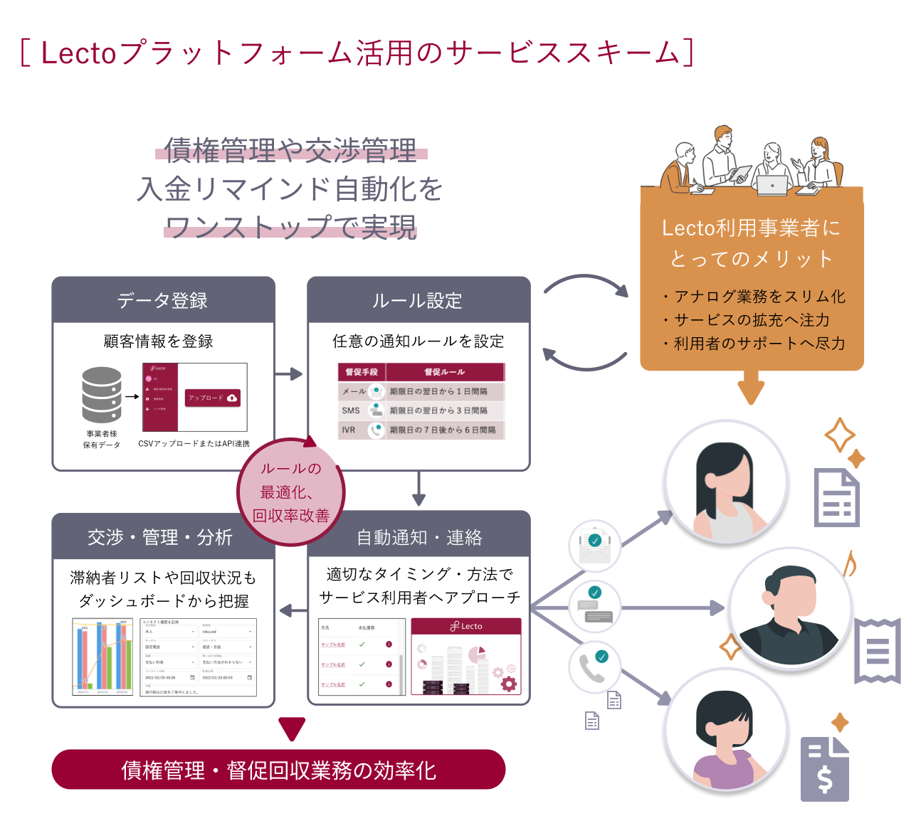 Lectoは、「督促回収テック」を展開するFintech関連企業です。金融サービスやリテール・サブスクリプションサービスの裏側(バックエンド)にある面倒な実務や複雑で属人化しやすい業務フローを改善し、債権管理(顧客管理)・回収からオフバランスまで一気通貫での課題解決を目指しています。それにより顧客満足度、サービスUXの向上を目指すことが可能になります。