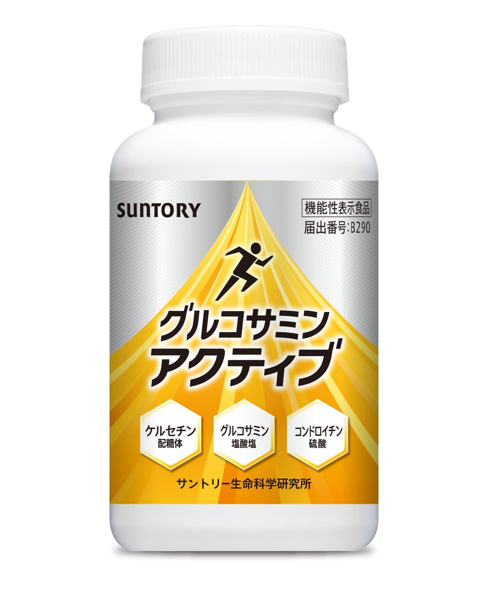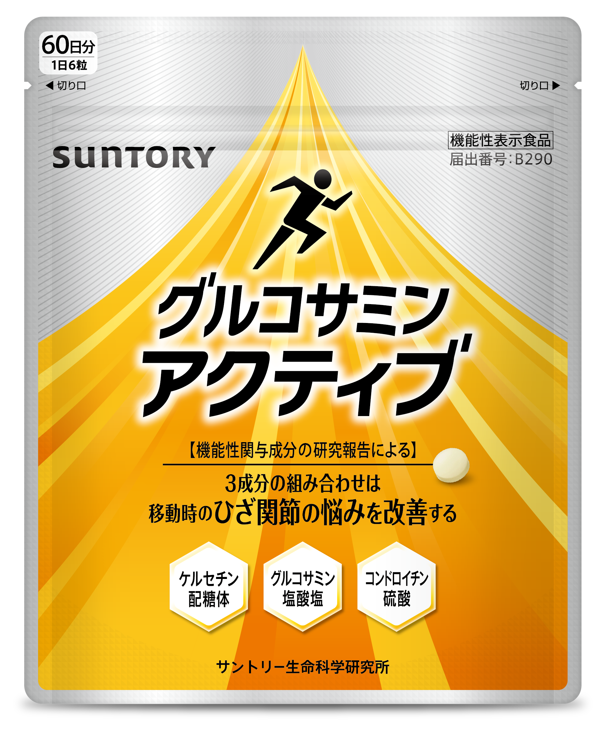 「ひざメンテナンス」でアクティブな毎日を応援する「グルコサミンアクティブ」は、「グルコサミン塩酸塩」「コンドロイチン硫酸」のダブルの“軟骨成分”と、ひざの違和感を抑える“いたわり成分”「ケルセチン配糖体」の3成分を配合した機能性表示食品です。この3成分は脚の研究を20年以上続けてきたサントリーがたどり着いた独自の組み合わせで、特許を取得(※3)しています。この3成分の組み合わせにより、移動時のひざ関節の悩みを改善することが報告されています。