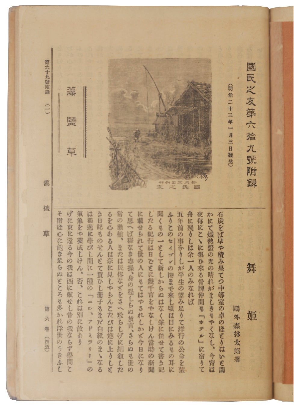 『舞姫』の初出誌。新作小説を紹介する「藻塩草」欄に「鴎外森林太郎著」の署名で掲載された。