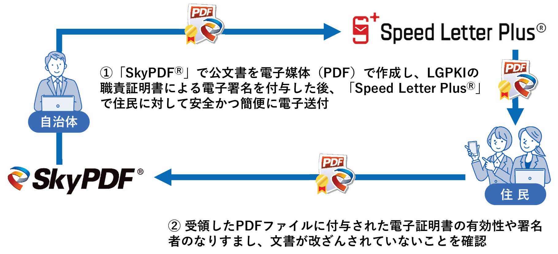 凸版印刷の通知物電子送付サービス「Speed Letter Plus®」と、職責証明書を使用して電子署名を付与できるスカイコムのPDFソリューション「SkyPDF®」を連携。「SkyPDF®」により公文書の作成から職責証明(LGPKIが発行)を使用した電子証明書を付与した後、「Speed Letter Plus®」で住民に対して安全かつ簡便に電子送付、再び「SkyPDF®」で受領後の署名検証までを行う事で通知物の安全・安心な電子送付を一連で実施できるサービスの開発を推進します。これにより、行政事務の効率化やペーパーレスによるコストダウンを実現し、行政サービスの利便性の向上を支援します。