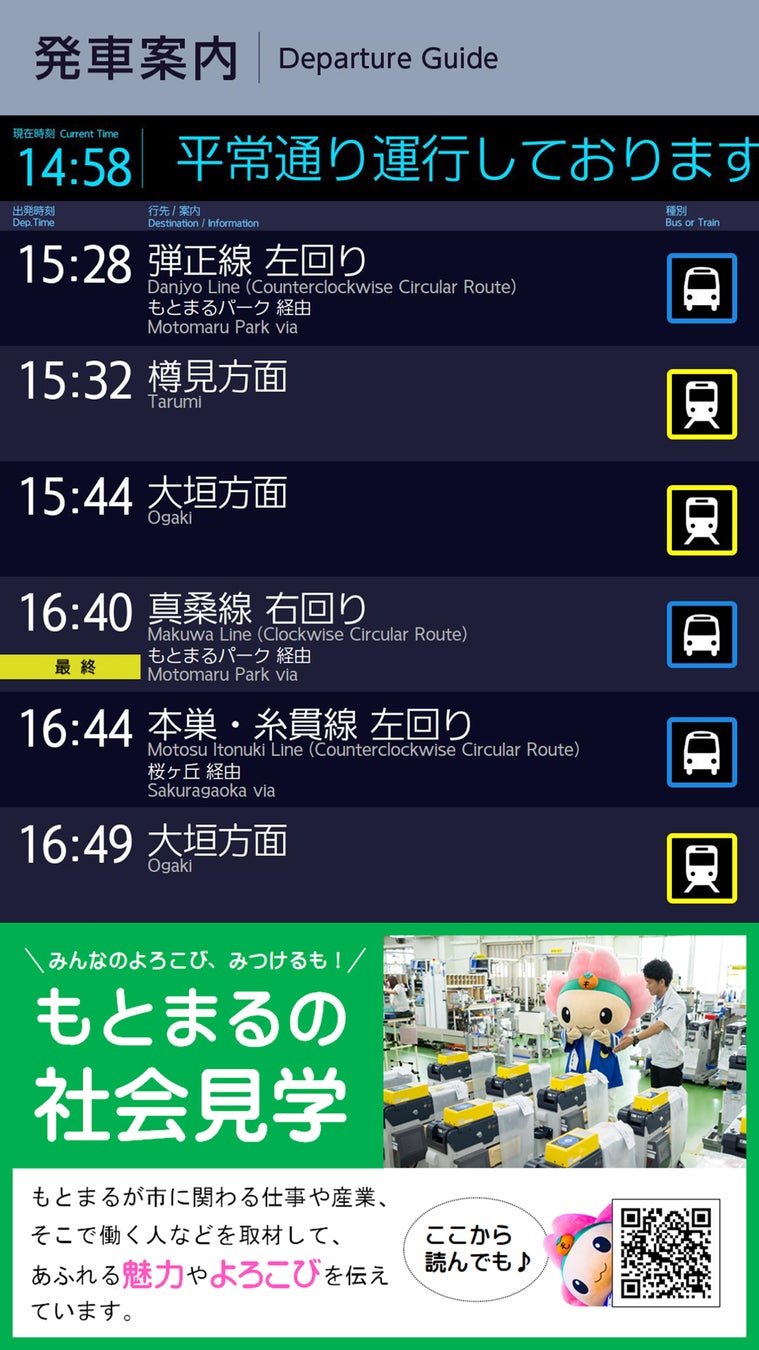・本巣市市役所総合案内カウンター近くに設置した55インチの大型液晶ディスプレイに、本巣市営バス(本巣市役所・新庁舎)、樽見鉄道(モレラ岐阜駅)の時刻表、及び運行状況を表示します。 ・同一のサイネージ内にて、本巣市からのお知らせ、広告などを表示することもできます。 |