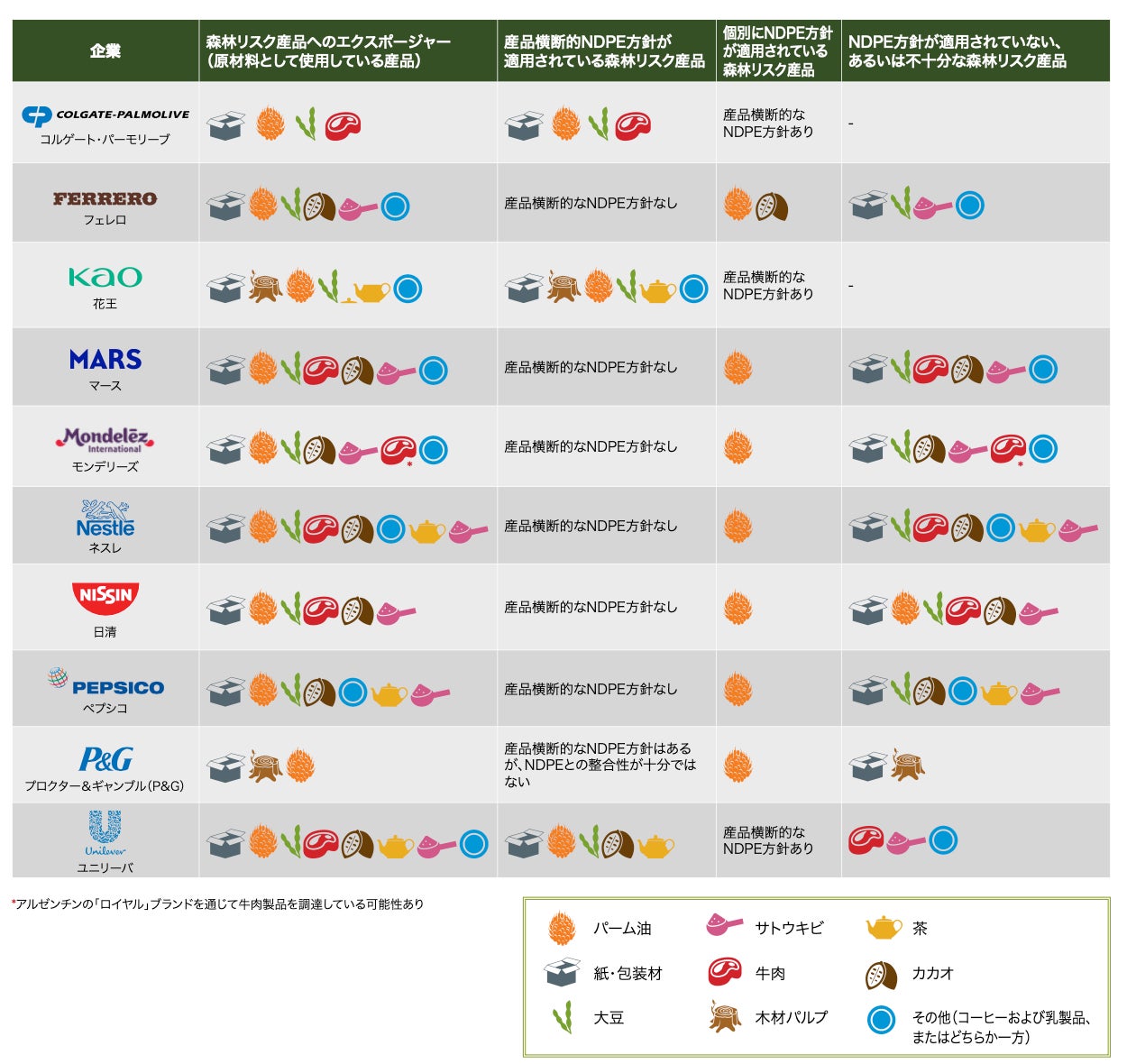 表「消費財企業各社の調達する森林リスク産品と、実際のNDPE方針適用範囲の比較」