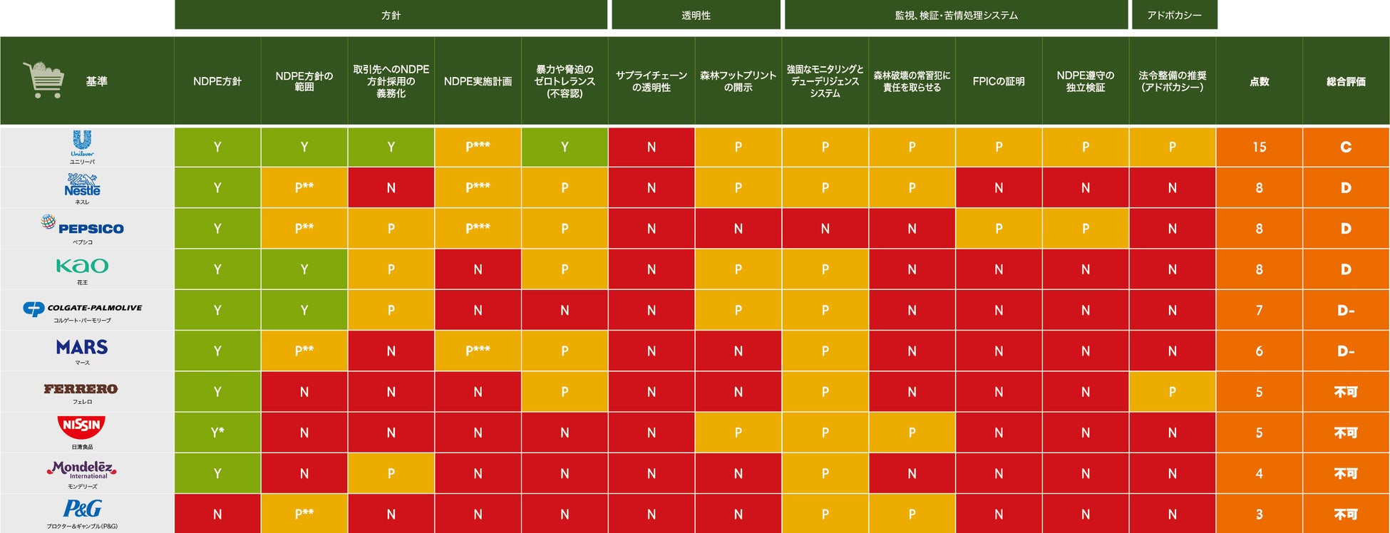 取り組みが最も遅れていると評価された「不可企業」は日清食品、フェレロ、モンデリーズ、P&Gでした。P&Gは森林リスク産品セクターの横断的方針を公表した際に森林保護の要件を弱体化し、実質的に後退しました。