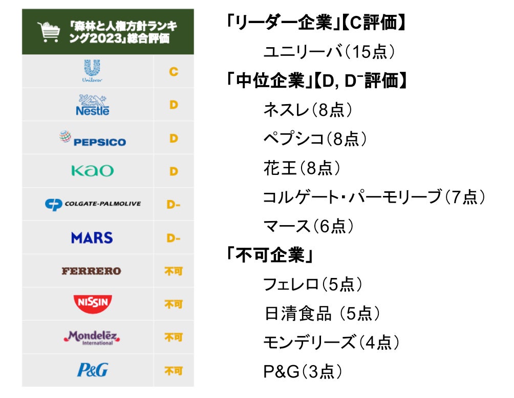 ユニリーバがトップ、P&G最下位、日清食品は改善するも取り組み遅れ〜大手消費財企業、森林破壊と人権侵害防止を公約するも阻止できず〜 グローバル消費財企業10社の森林及び人権方針を評価