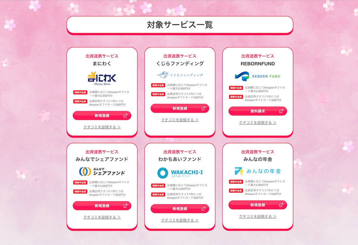 キャンペーン期間中に対象サービスに出資すると、出資額に応じて1サービスあたり最大で5,000円分のAmazonギフトをもれなくプレゼントするキャンペーンで、提携中の6サービス※合計で30,000円分のAmazonギフトを獲得することができるキャンペーンです。