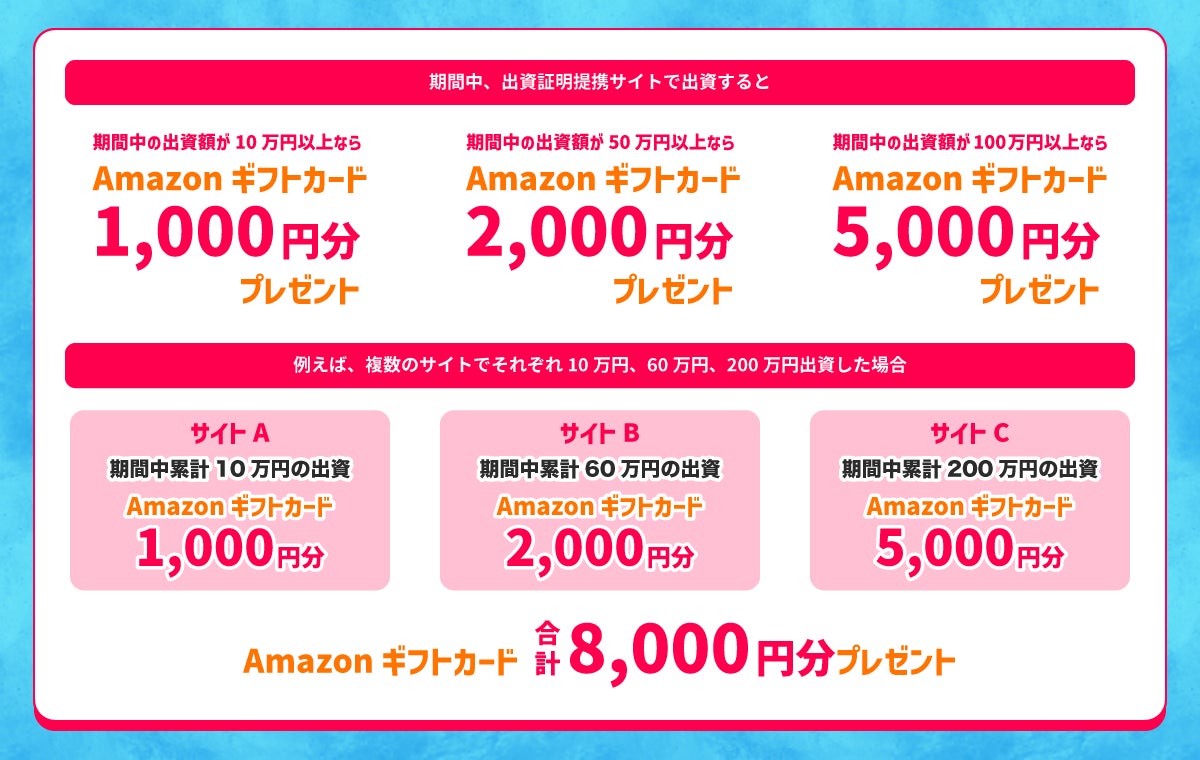 期間中、対象サービスで出資をすることで、出資額に応じてAmazonギフトカードをプレゼントするキャンペーンです。
