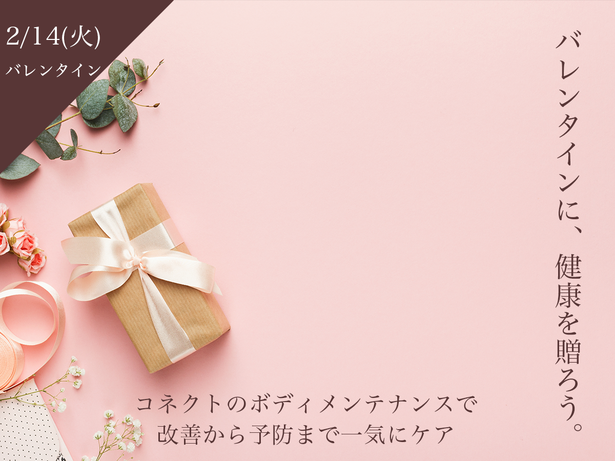 肩こり腰痛等の不調改善から、より日常生活が快適になるための疲れにくいカラダ作りまでをサポートする独自手法オールインワンアプローチ™を活用した「ボディメンテナンス」を提供する「co-nect」(運営会社:株式会社co-nect、 東京都新宿区、代表取締役:中山友貴)は、バレンタイン期間限定で「健康」をお届けするボディメンテナンス・バレンタインギフトを開始します。