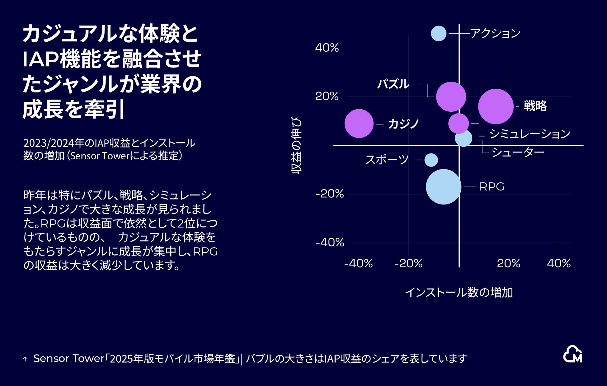 カジュアルゲームのアプリ内課金(IAP)が収益成長を牽引:カジュアルゲームのIAPが収益成長を促進しており(前年比6%増)、戦略ゲームアプリがカジュアルな体験へのシフトの恩恵を受けています。一方で、RPGジャンルではグローバル全体で収益・インストール数ともに減少しており、深みあるゲームプレイをより親しみやすい形でグローバル市場に適応させられる日本のゲームパブリッシャーにとって、新たな機会が生まれています。