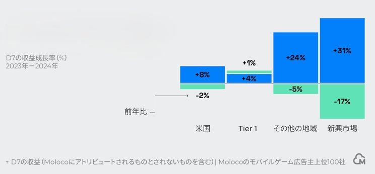 新興市場やその他の地域ではiOSユーザーが高い成長を見せる:新興市場(インド、ブラジル、メキシコ、インドネシア)やその他の地域(米国およびTier 1、新興市場以外の地域)では、iOSユーザーが高い成長(前年比:新興市場 31%増加、その他の地域 24%増加)を見せています。主要広告主は、幅広いユーザー層に合わせた体験設計、ライブオペレーションによる長期的なマネタイズ、新しい市場へのユーザー獲得予算の分散投資を通じて、グローバルな成長を実現しています。