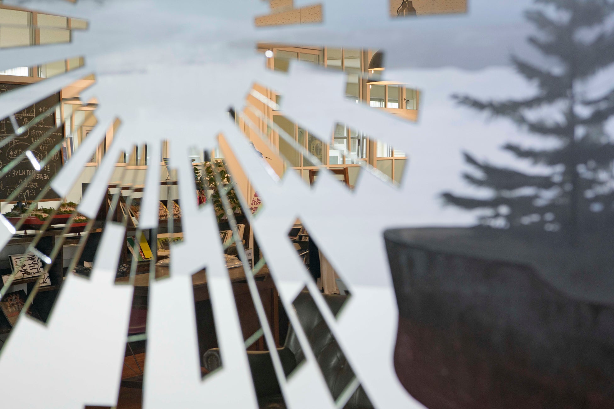 栗林氏の作品は、放射線状に配置された鏡により構成されています。鏡は部屋の風景と訪問者自身の姿を映し出し、鑑賞者も作品の一部となります。