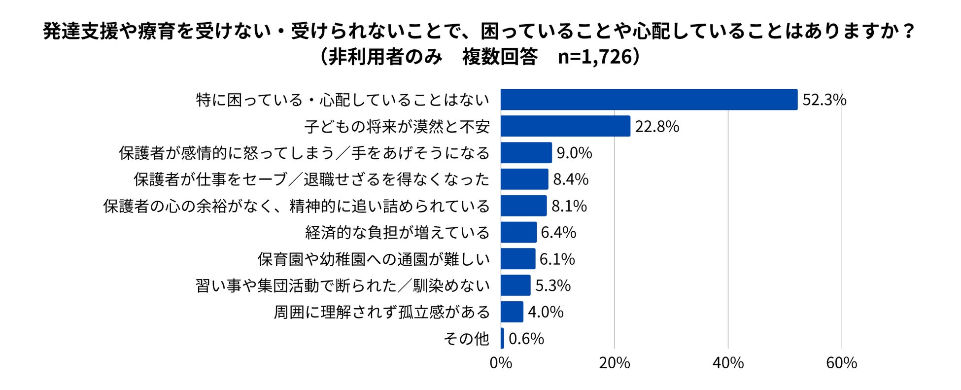 発達支援サービス・療育を受けていない1,726名に、困っていることや心配していることについて聞きました。最も多かった「特に困っている・心配していることはない」が52.3%で、約半数の保護者が適切な支援を受けないことによる何らかの問題を抱えていることが分かりました。具体的には「子どもの将来が漠然と不安」が22.8%で最も多く、次いで「保護者が感情的に怒ってしまう・手をあげそうになる」が9.0%、「保護者が仕事をセーブ・退職せざるを得なくなった」が8.4%となりました。