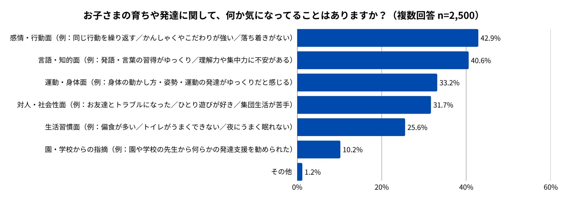 子どもの発達で気になることを複数回答で聞いたところ、「感情・行動面(42.9%)」が最も多く、次いで「言語・知的面(40.6%)」、「運動・身体面(33.2%)」となりました。感情・行動面では、かんしゃくやこだわりの強さ、落ち着きのなさなどが主な不安要因として挙げられており、日常生活における子どもの行動コントロールに多くの保護者が悩んでいることが明らかになりました。