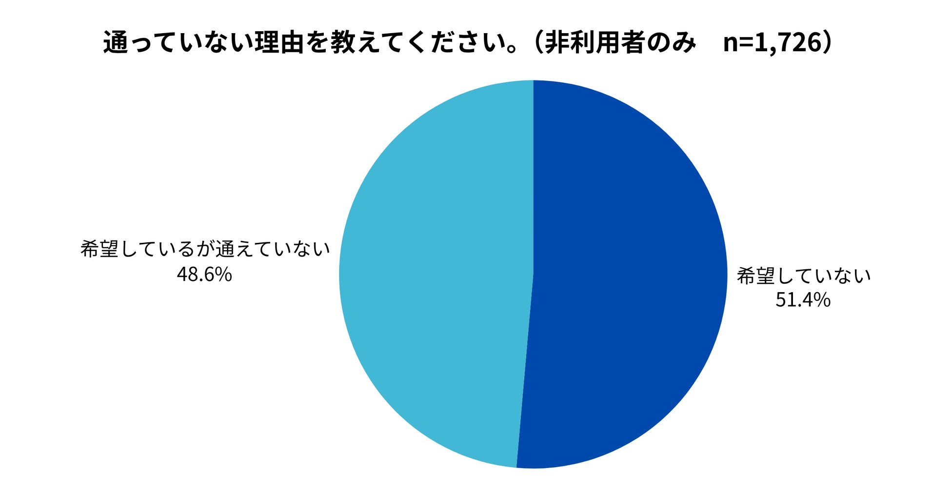 発達支援サービス・療育を受けていない1,726名に、その理由について聞きました。このうち「希望していない」と回答したのは51.4%(887名)でしたが、残りの48.6%(839名)は希望しているにもかかわらず、適切な支援を受けられていない“療育難民”状態であることが判明しました。