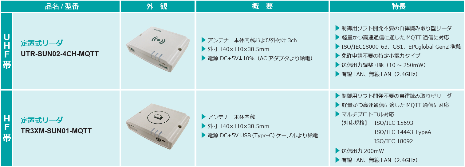 型番 | UHF帯:UTR-SUN02-4CH-MQTT HF帯:TR3XM-SUN01-MQTT |