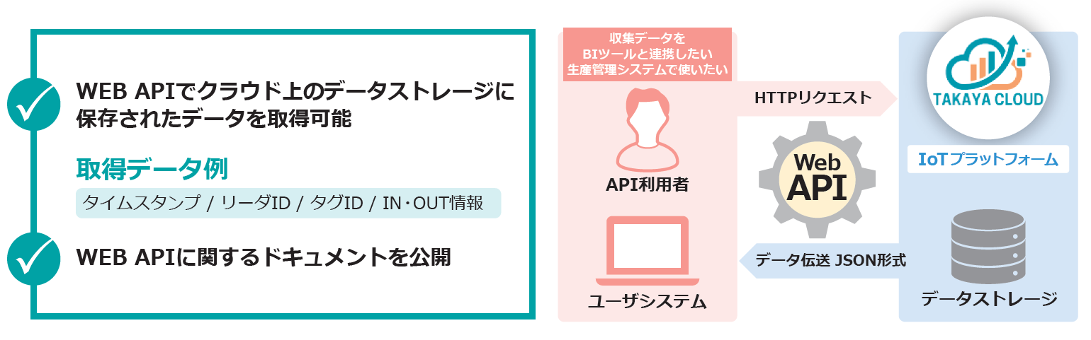 リーダから収集した、タグを置いた(IN ) タグを離した(OUT)のデータをWEB APIで取得できるため