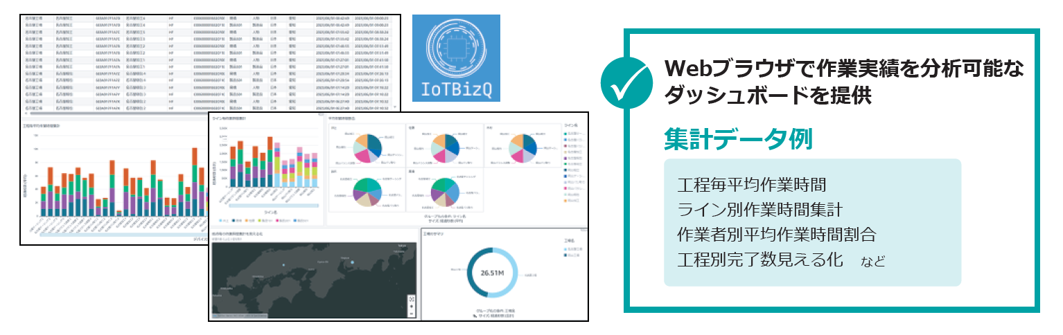 収集されたデータを利用してダッシュボード表示を行い、分析や状況確認など“見える化”を実現します。