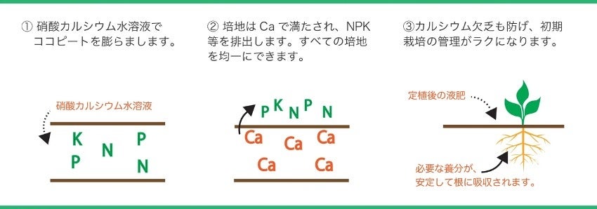 バッファリングとは、初期栽培を安定させる前処理で、硝酸カルシウムを培地に置換させて、初期栽培を安定させるための前処理作業です。ココピートの電気伝導率には許容範囲内のばらつきがあり、培地中に存在する陽イオンの比率にもばらつきがあります。そのため、ECの最小値、最大値に関わらず、栽培に使用するすべてのココピートのバランスをとる必要があります。(※)