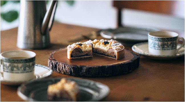 自家製タルト生地をベースに、甘酸っぱいカシスフィリングと、マロン×アーモンドのリッチなクリームを絞りました。トッピングには秋を感じる栗を贅沢にごろごろと。ほろっとした食感のクランブルものせて食感も楽しめるように焼き上げました。甘酸っぱいカシスと濃厚なマロンが口いっぱいに広がる、この季節だけの組み合わせをどうぞご堪能ください。