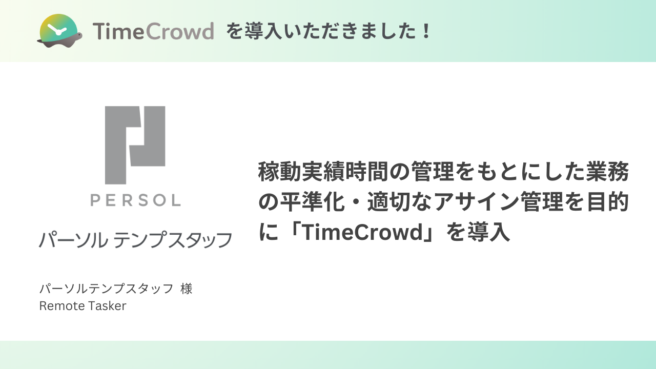 この度、 パーソルテンプスタッフ株式会社では稼働実績時間の管理をもとにした業務の平準化・適切なアサイン管理に向けて、「TimeCrowd」をご導入いただきました。