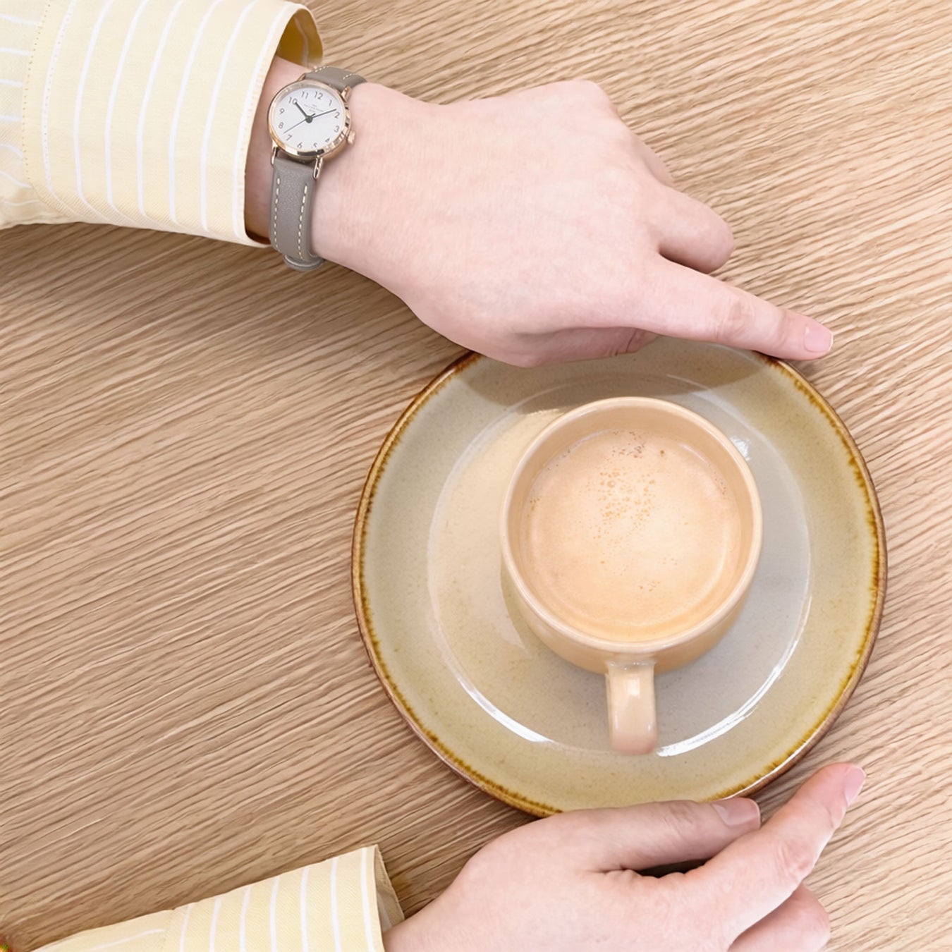 カップの上からのぞき込む、ミルクをたっぷり注いだラテのようなやさしい色合いで手元を柔らかに彩ります。