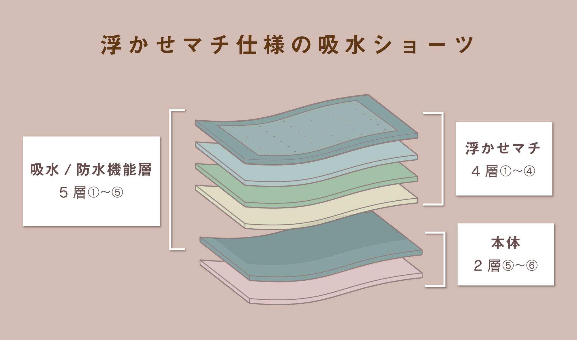 デリケートゾーンに当たるクロッチ部分にはすべて日本製の生地を使用。内側から順に、「ドライメッシュ+防水シート」「ドライタッチパイルの吸水シート」「抗菌保水シート」「モレにくい透湿防水シート」×2枚「フェアリーサーモ」の6層設計で、体液をしっかりと吸水します。