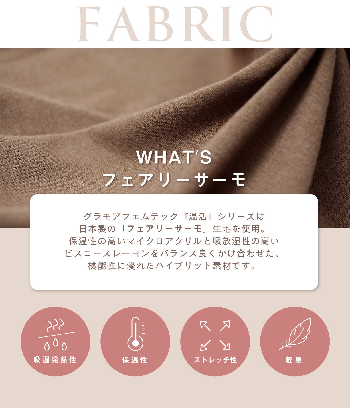 「腹巻吸水ショーツ」は、保温性の高いマイクロアクリルと吸放湿性の高いビスコースレーヨンをバランスよく掛け合わせたハイブリッド素材「フェアリーサーモ」を使用しています。「吸湿発熱性が高く、着用した瞬間から温かい「保温性に優れていて温かさ持続する」といった特徴のほか、マイクロアクリルが一般的なアクリル繊維の半分以下の太さであるため、チクチクしにくく滑らかな肌触りであることもメリットです。