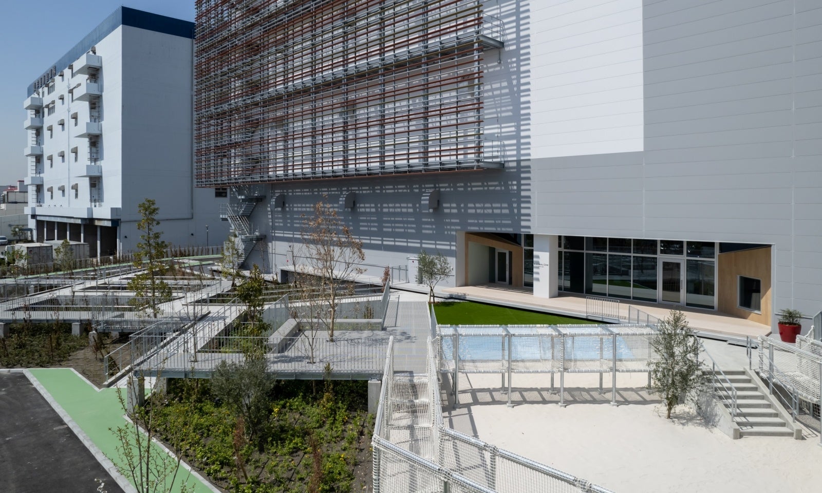 ESRが物流施設でいち早く提案し、子育て世代の支援策として定評を頂いている託児所「BARNKLÜBB(バーンクラブ)」は建物南側の1階に設置。園庭は「キャノピーウォークガーデン」をコンセプトに、砂場や樹木の上に吊り橋のようなアスレチックネットを設置し、子供たちが回遊しながら飛んだり跳ねたり寝転んだり冒険心をくすぐるデザインにし、保育室のメインルームは小屋に囲まれた広場をイメージし、お子様たちが生き生きと楽しく過ごせる空間デザインにしました。