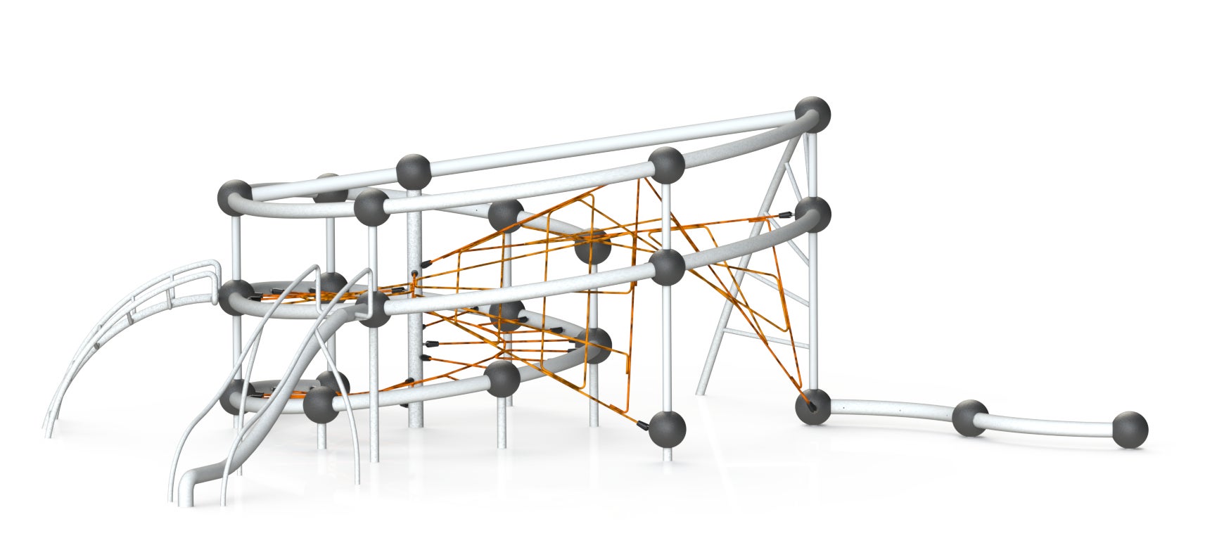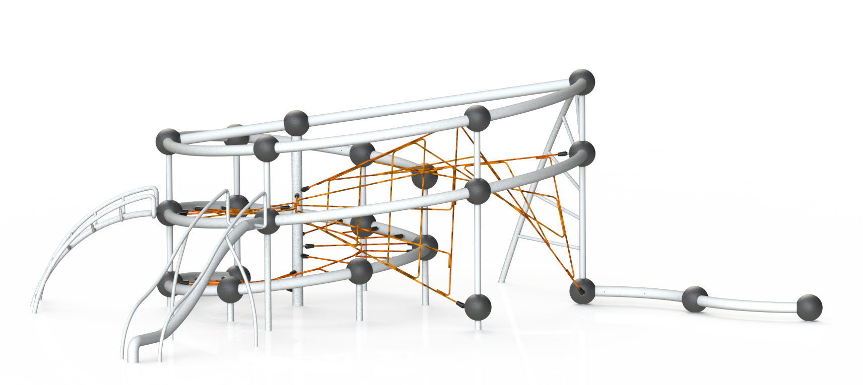 支柱と梁、ジョイントパーツとロープネットだけのシンプルな構造にも関わらず、曲線と傾きの変化だけで他社にはない個性的なデザインに昇華させている。有機的なフォルムは幼児の好奇心を掻き立てるデザインだが、同時に安全性も担保しており、見た目だけでなく膨大な量の検証を重ねて生まれた非常に優れたデザインである。グレーと黒のベースにオレンジのロープがアクセントのこれまでの遊具にはないカラースキームも、様々な条件の空間に馴染むことができ、思い切った提案が功を奏している。